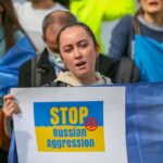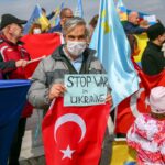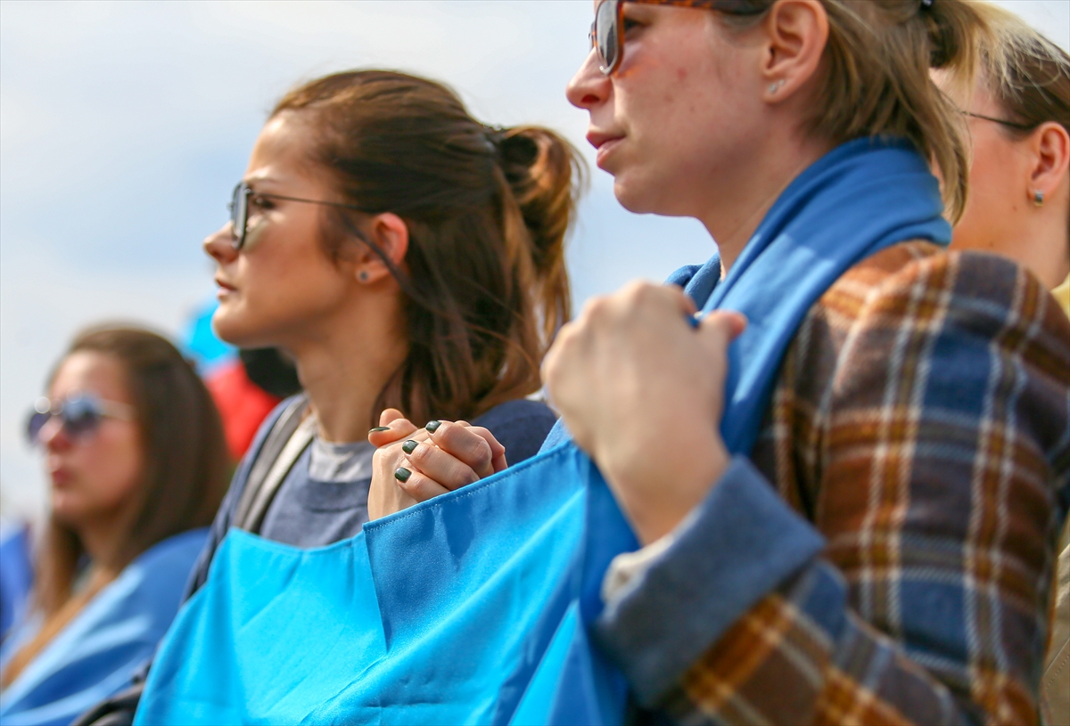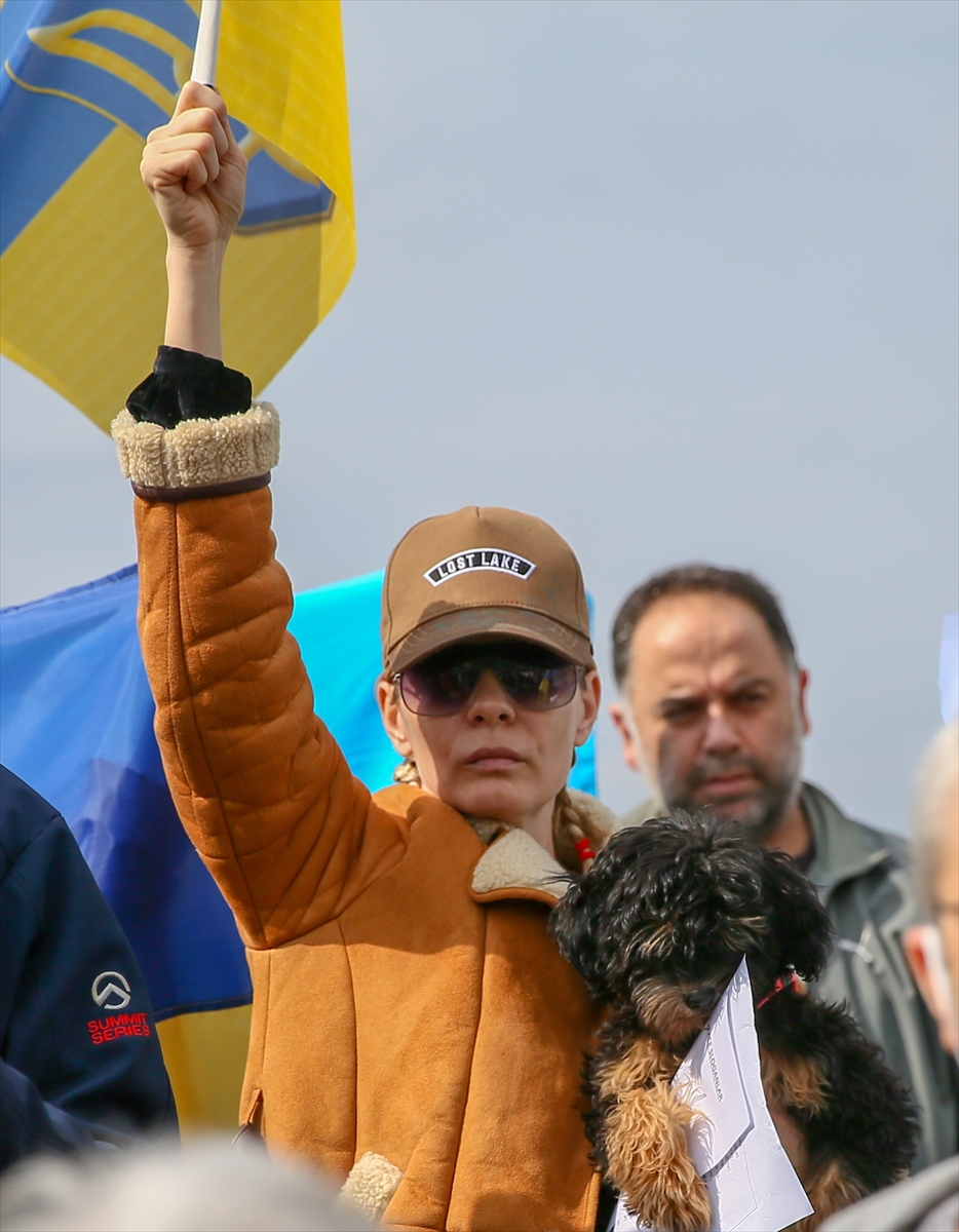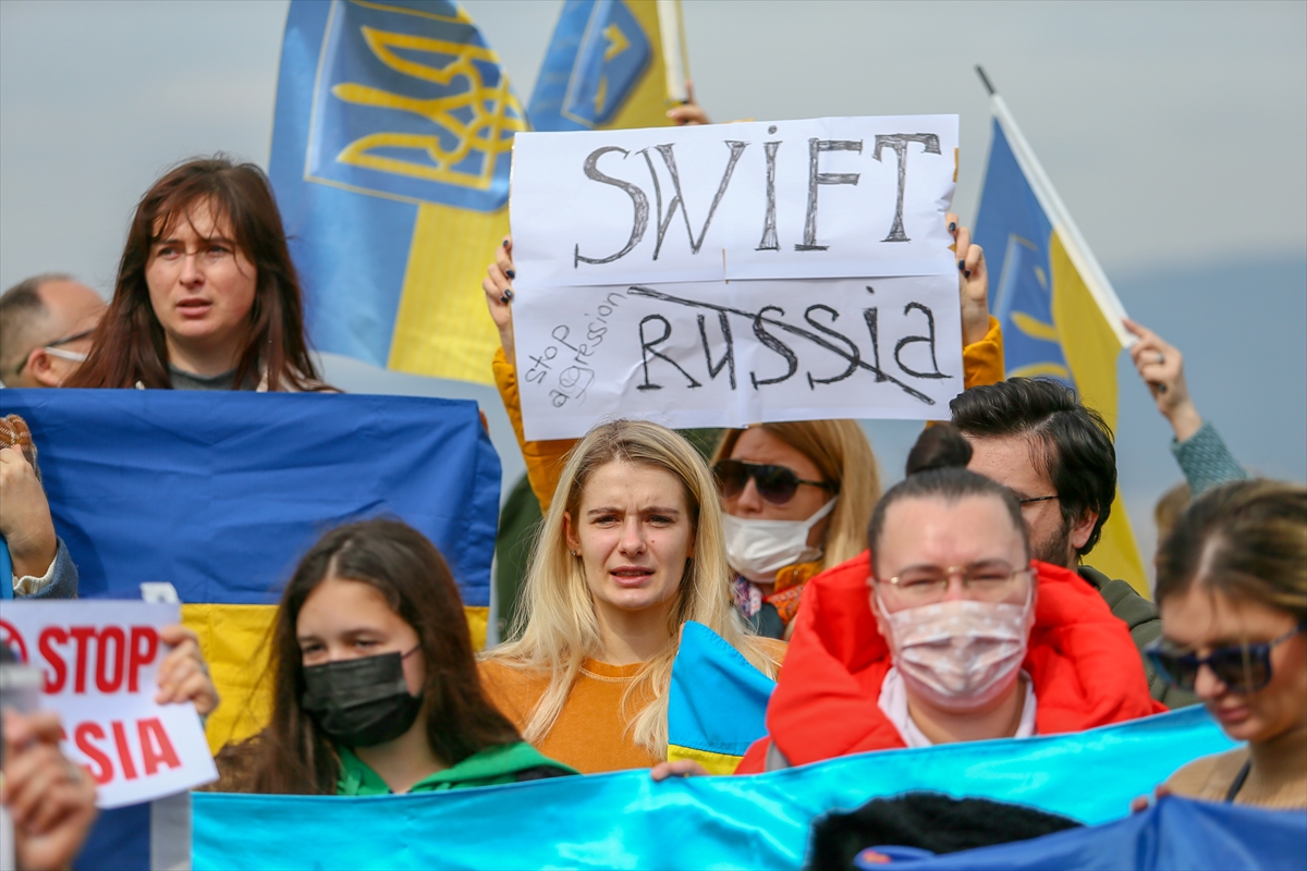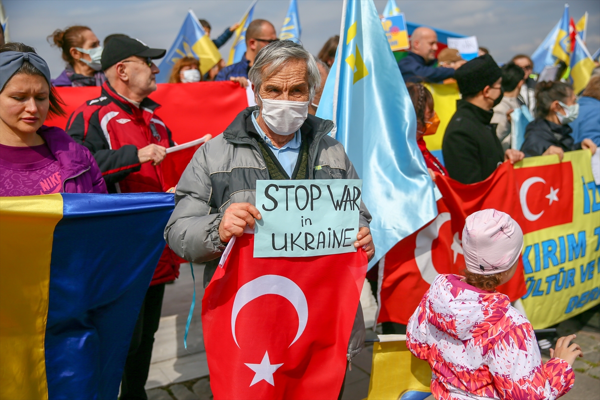 Türk ve Ukrayna bayrakları taşıyan grup, "Savaşa hayır", "Saldırıları durdur Rusya" pankartları açarak, Rusya aleyhine sloganlar attı.