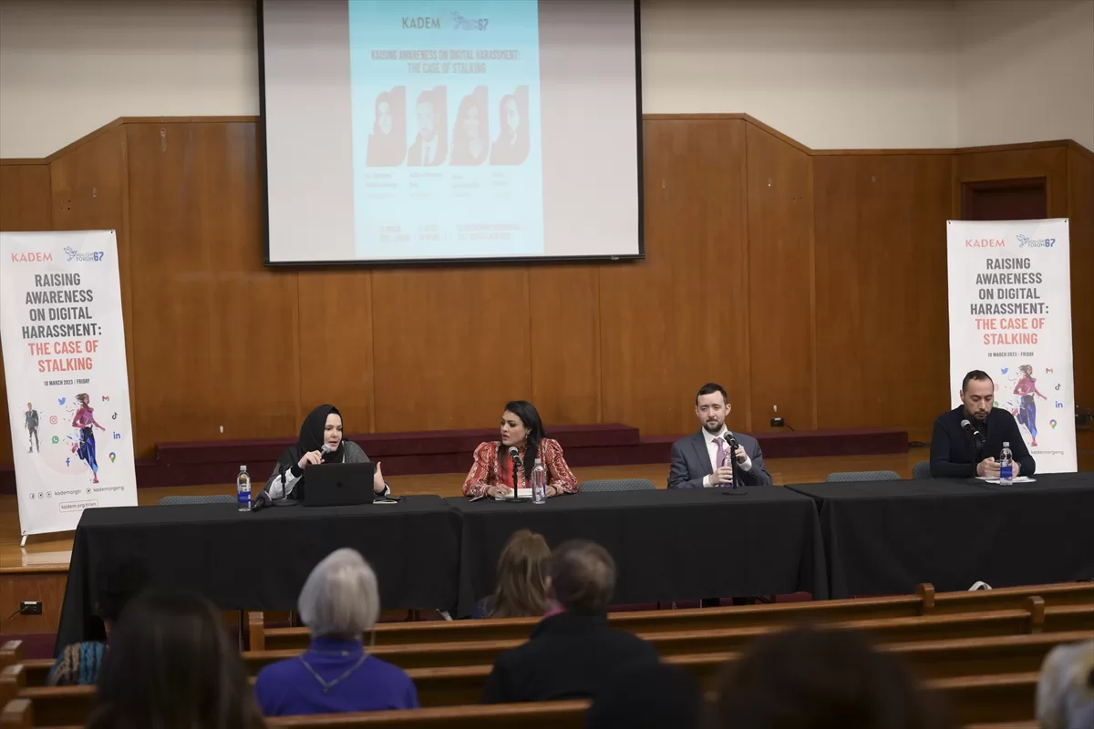 Salvation Army Auditorium'da "Dijital Şiddete Karşı Farkındalığı Artırmak: Israrlı Takip ile Mücadele" adıyla düzenlenen panel öncesinde KADEM'in akademi, eğitim, istihdam, hukuk gibi farklı alanlardaki çalışmaları hakkında bilgi verilirken, tüm dünyada kadınların, ısrarlı takip adı verilen şiddet türüyle karşı karşıya olduğu belirtildi.
