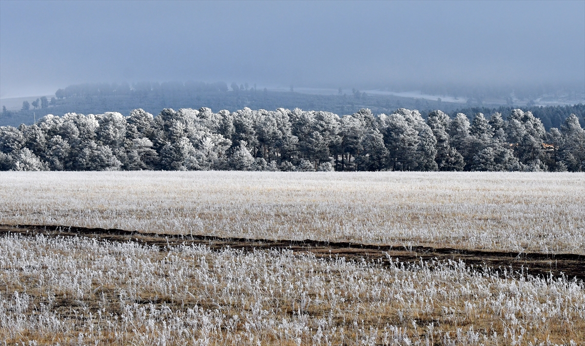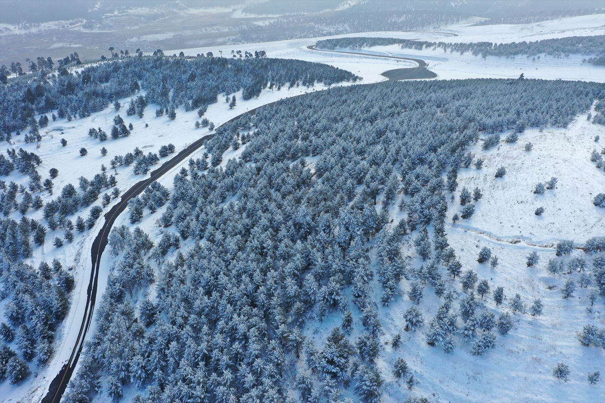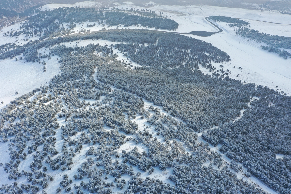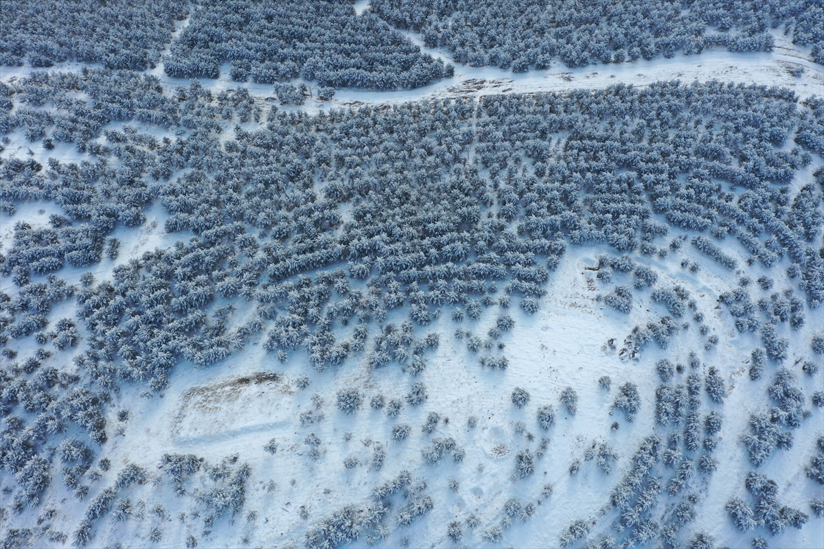 Boz ayı, vaşak, kurt, tilki başta olmak üzere birçok yaban hayvanına doğal yaşam alanı sunan sarıçam ormanlarını, önceki günlerde etkili olan karla beyaz örtü kapladı.