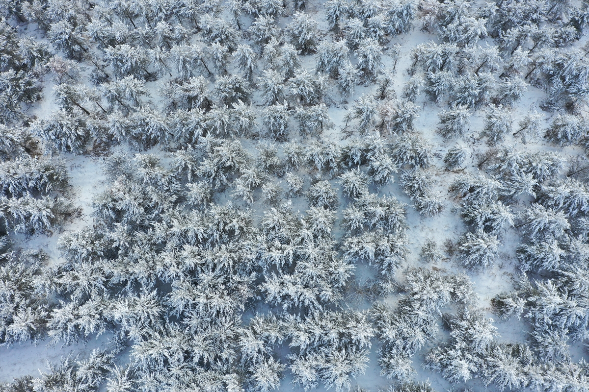KARS (AA) -Kars'ın Sarıkamış ilçesindeki karla kaplanan ünlü sarıçam ormanları dronla görüntülendi.