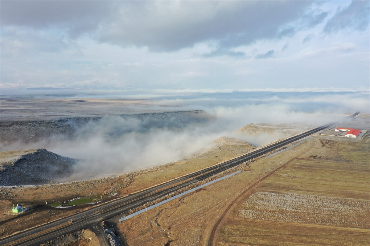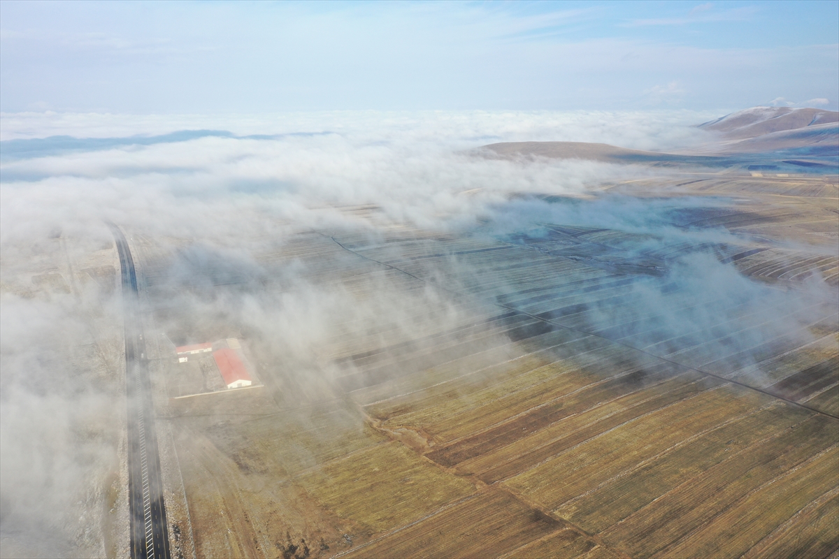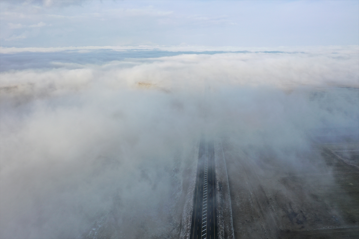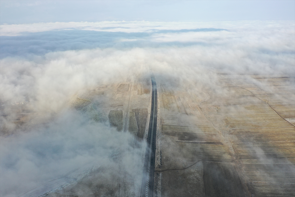 Selim ilçesinde, kara yolu ve tarlaların üzerini kaplayan sis, güzel manzara sundu.