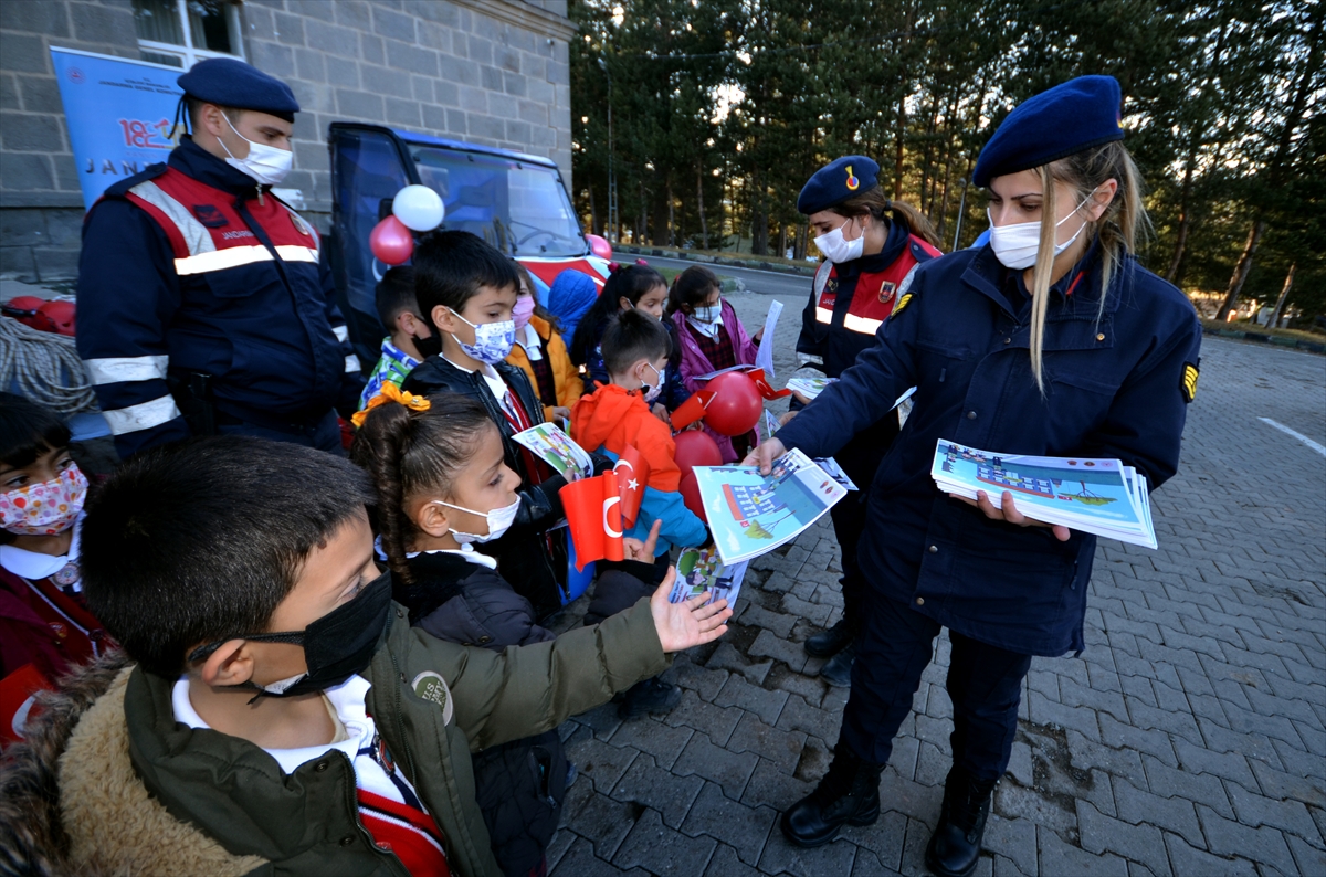 Jandarmanın araçlarıyla okullardan alınıp ilçedeki jandarma komutanlığı yerleşmesine getirilen öğrencilere, jandarmanın yürüttüğü faaliyetler anlatıldı.