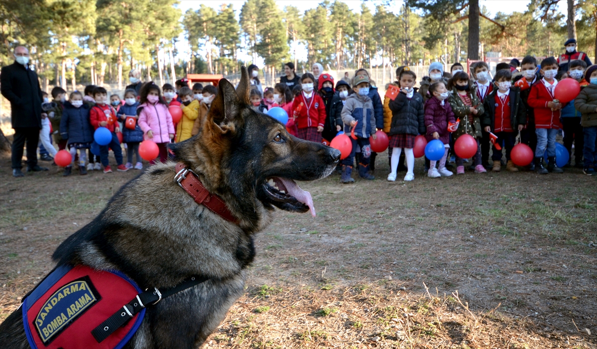 Etkinlikte, jandarma bomba arama köpeği "Öfke" de eğitmeni uzman çavuş Mürsel Ergişi'nin komutlarıyla öğrencilere gösteri sundu.