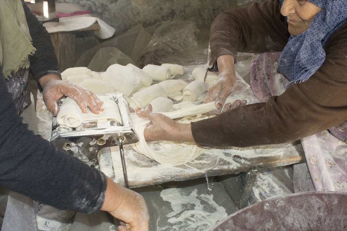 Akyaka ilçesinde akşam bir araya gelen kadınlar, ürettikleri unları imece usulü yoğuruyor. Sonrasında dinlendirilen hamur, sabah makineyle tel tel ayrılarak ipe serilip güneşte kurutulmaya bırakılıyor.