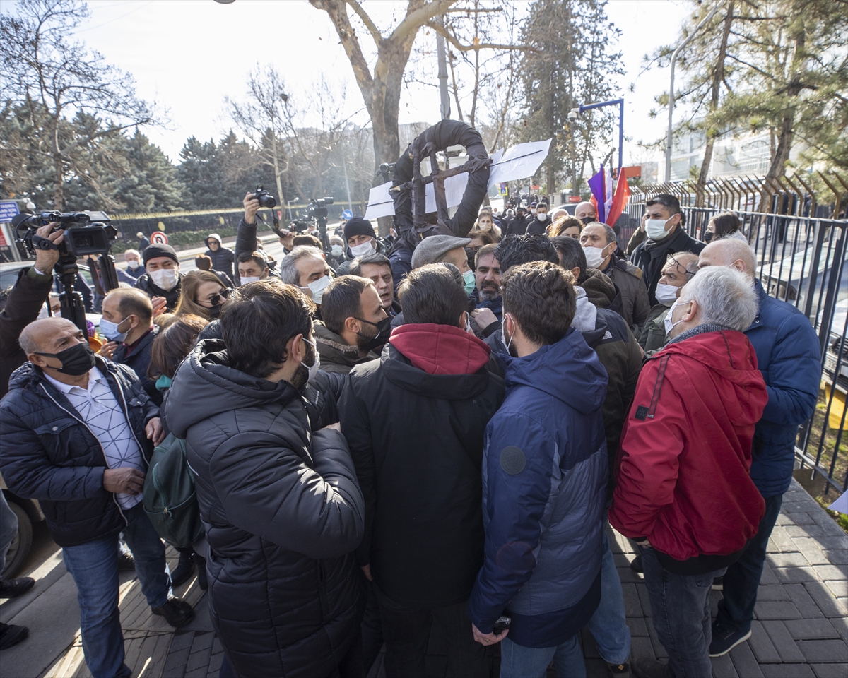Açıklamanın ardından TÜİK'in önüne bırakmalarına izin verilmeyen siyah çelenkle yürümek isteyen grup ile polis arasında kısa süreli tartışma yaşandı.