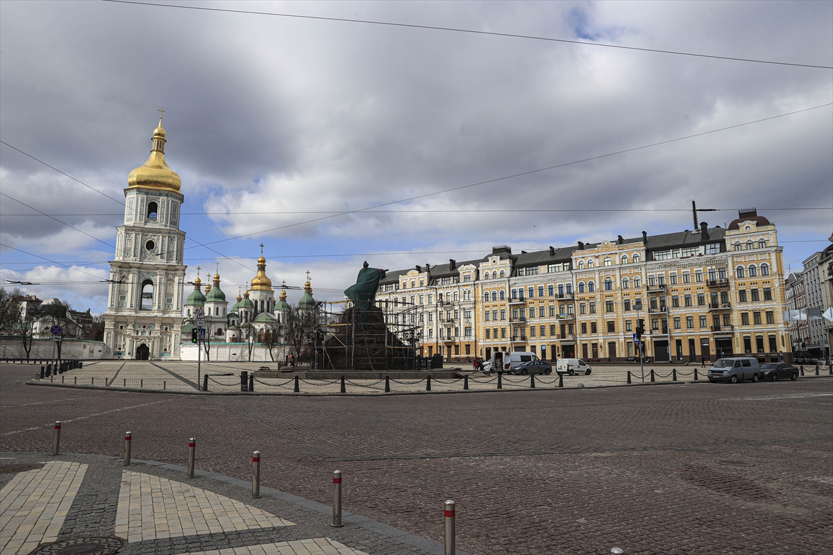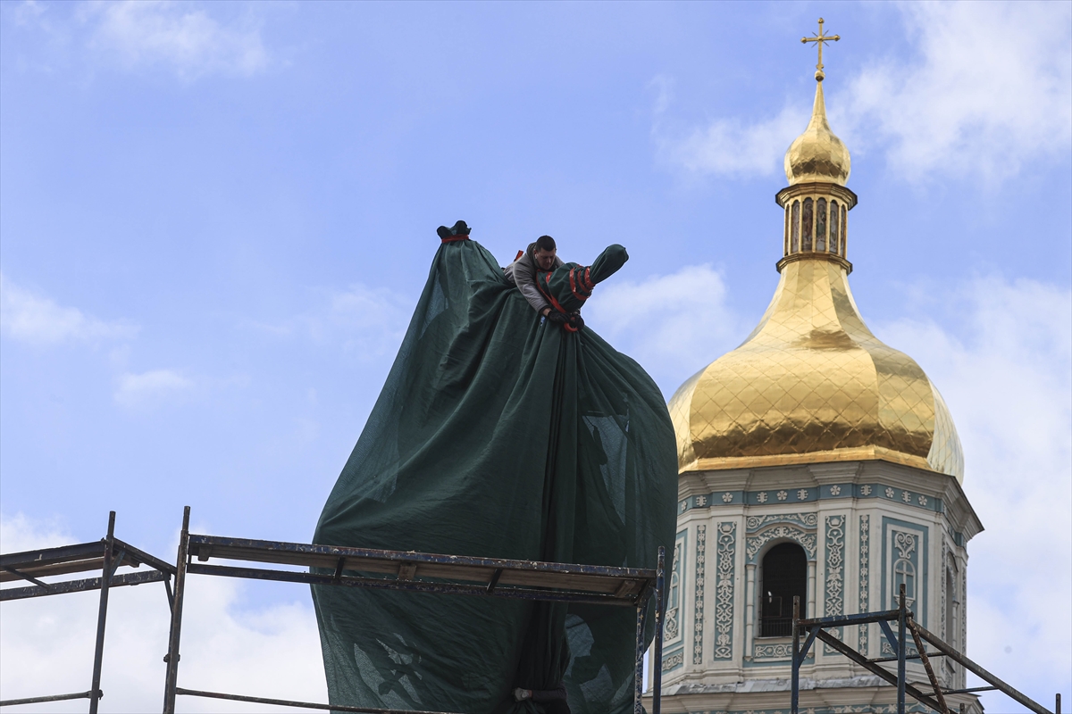 Ülkenin diğer bölgelerinde görülen sanat eserlerini saldırılardan koruma çalışmaları Kiev'in merkez caddelerindeki meydanlarda da başladı.