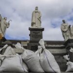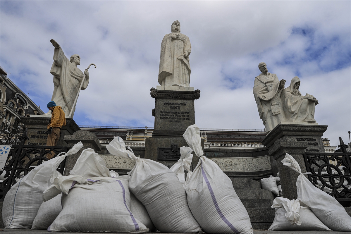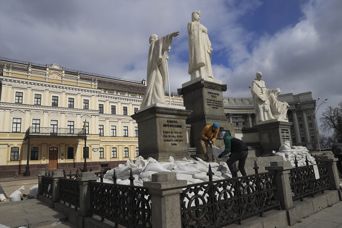 KİEV (AA) – Rusya'nın savaş açtığı Ukrayna'nın başkenti Kiev'de sanatevleri ve kiliselerin önünde yer alan büst ve heykeller belediye başkanlığı yetkilileri ve gönüllüler tarafından kum torbalarıyla ve tahtalarla kaplanarak koruma altına alınıyor.