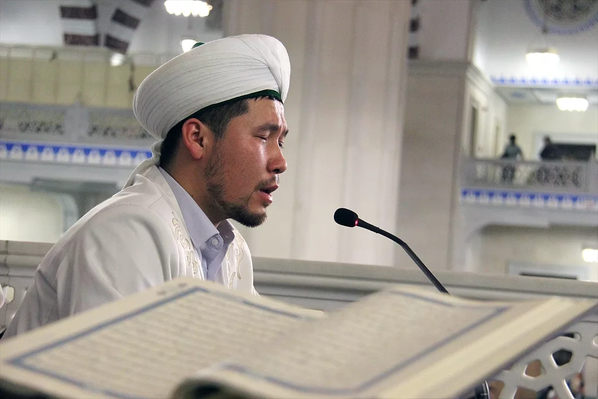 Başkent Bişkek'teki Cumhuriyet Merkez İmam Serahsi Camisi'nde teravih namazı öncesinde ülkenin müftüsü Zamir Rakiyev vaaz verdi.