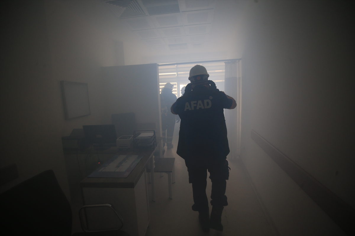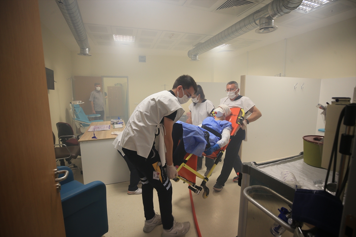 Senaryo gereği yaralanan ve dumandan etkilenen iki personele sağlık ekiplerince müdahale edildi.