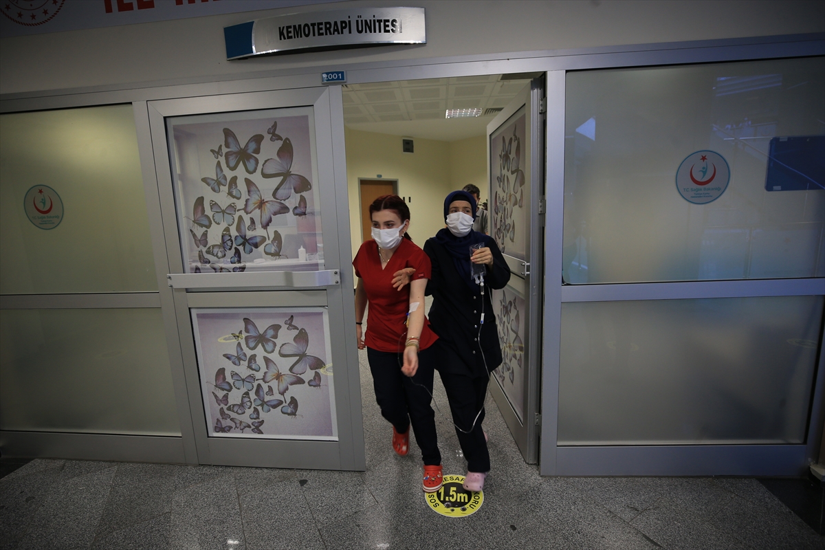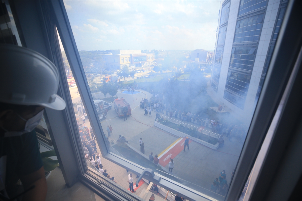 Tatbikatta senaryo gereği hastanenin üçüncü katındaki kemoterapi servisinde çıkan yangına ilk olarak sağlık personeli yangın tüpüyle müdahale etti.