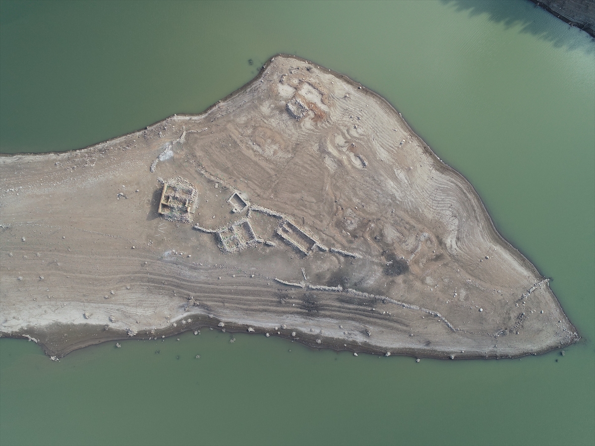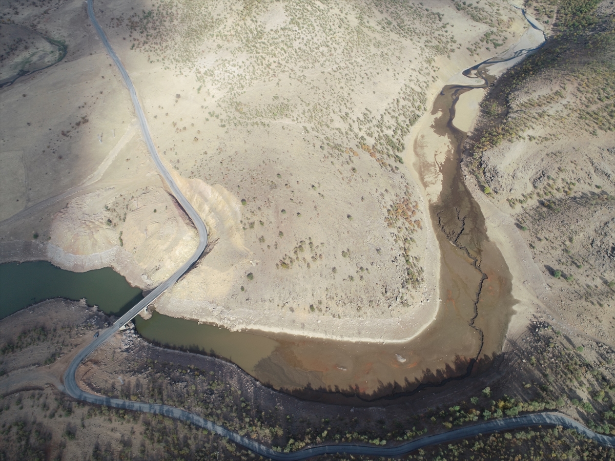 Barajı besleyen kaynaktaki kuraklık etkileri belirgin şekilde gözleniyor. Drone ile çekilen görüntülerde de su kaynağının kilometrelerce akmadığı görülüyor. Yer yer suyun çekildiği barajda bazı yıkılmış eski yapılar da ortaya çıktı.