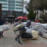 Toplanan malzemeler deprem bölgesine gönderilmek üzere paketlenerek kamyonlara yükleniyor.