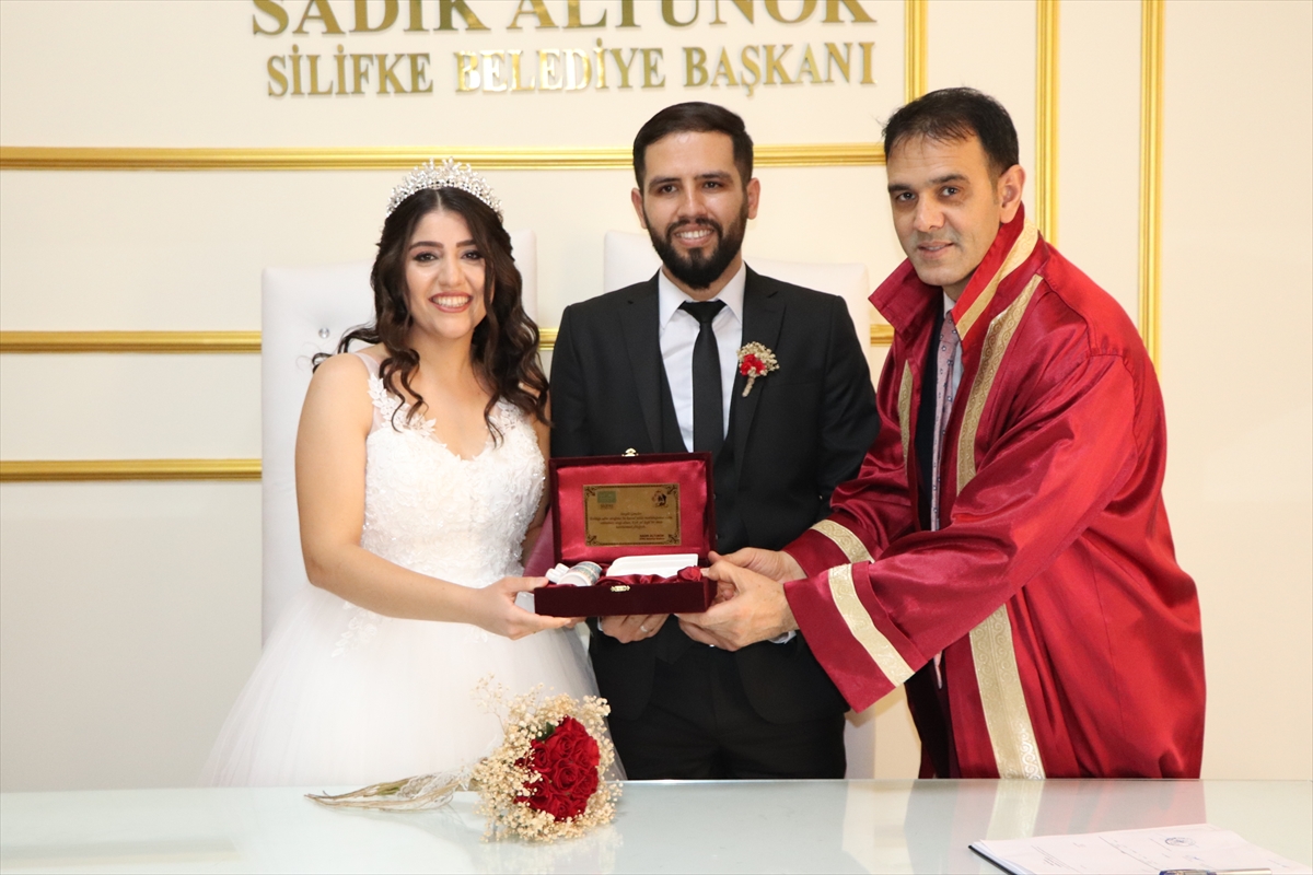Silifke Belediyesi Nikah Salonu'nda düzenlenen nikah töreninde genç öğretmenlerin nikahını Silifke Belediye Başkanı Sadık Altunok kıydı.