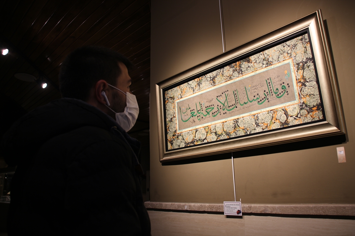 Ebru sanatının, hat, minyatür, kat'ı, cild, tezhib ve çini sanatlarıyla harmanlandığı sergide 40'a yakın eser sanatseverleri bekliyor.