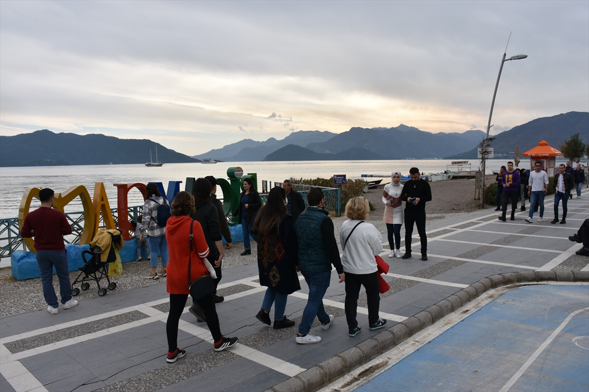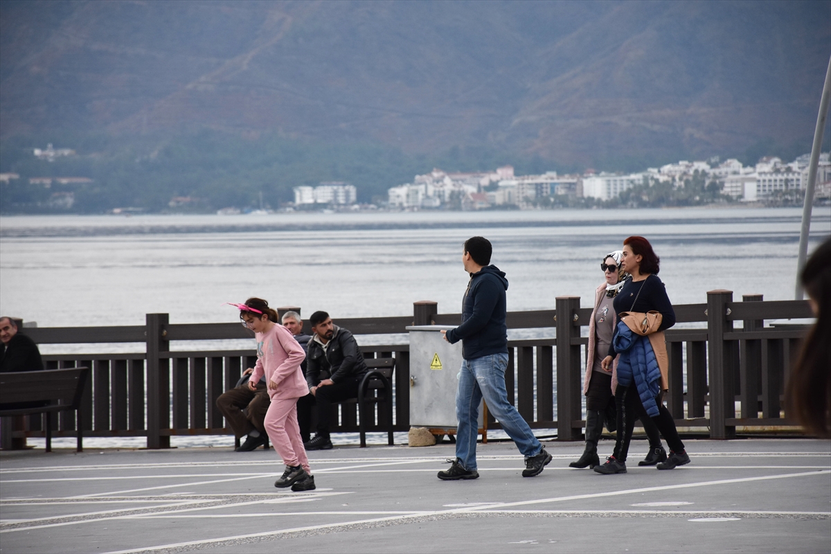 Hava ve deniz suyu sıcaklığının 19 derece ölçüldüğü Marmaris'te yılın ilk gününde insanlar, sahillerde vakit geçirmeyi tercih etti.