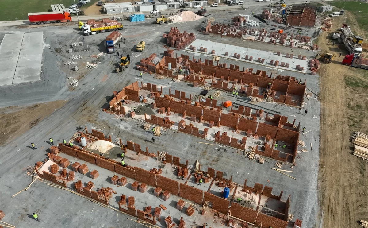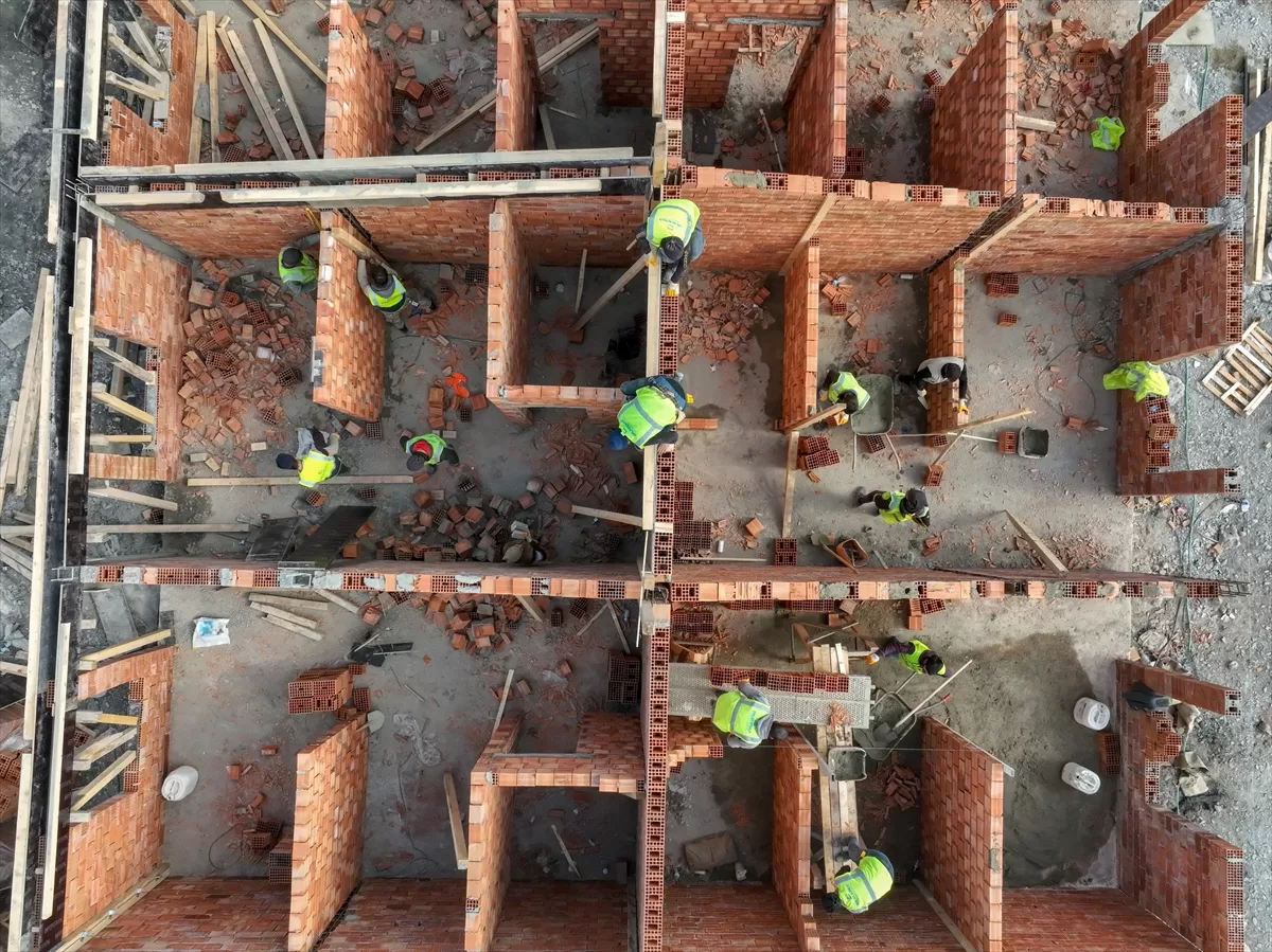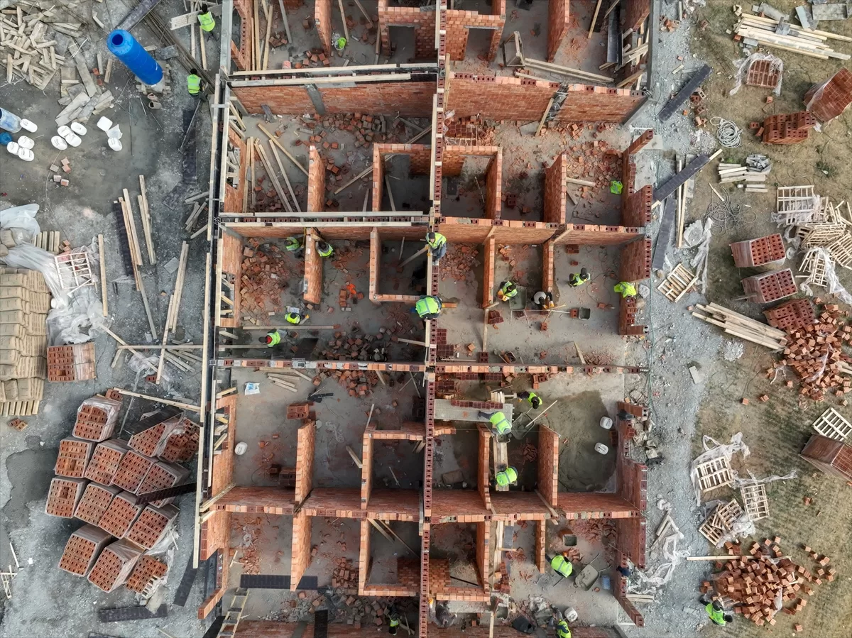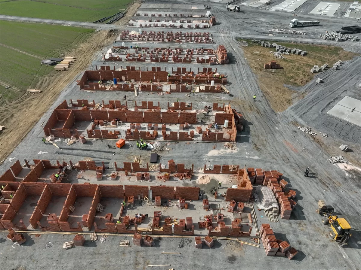 Altyapıları yapılan, zemin düzleştirme çalışmaları tamamlanan ve konteynerleri getirilen geçici barınma alanlarında inşaatına başlanan tuğladan evler de yükseliyor.