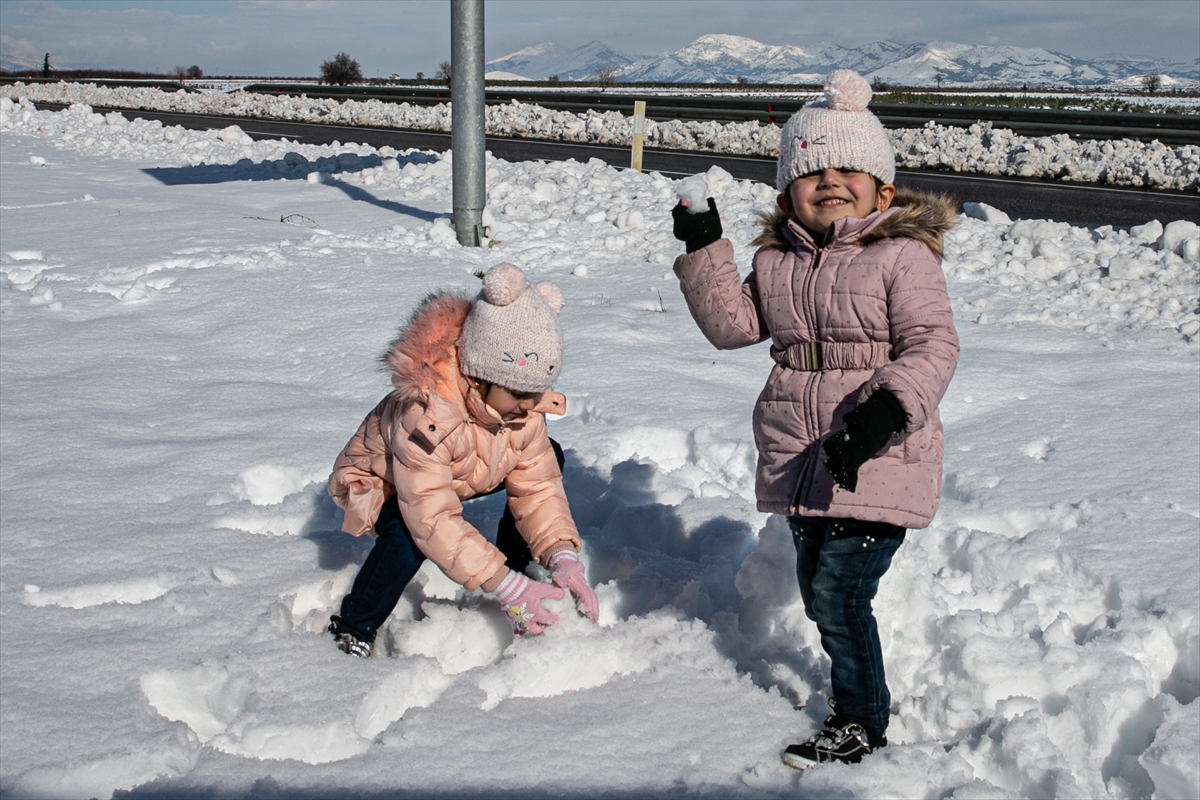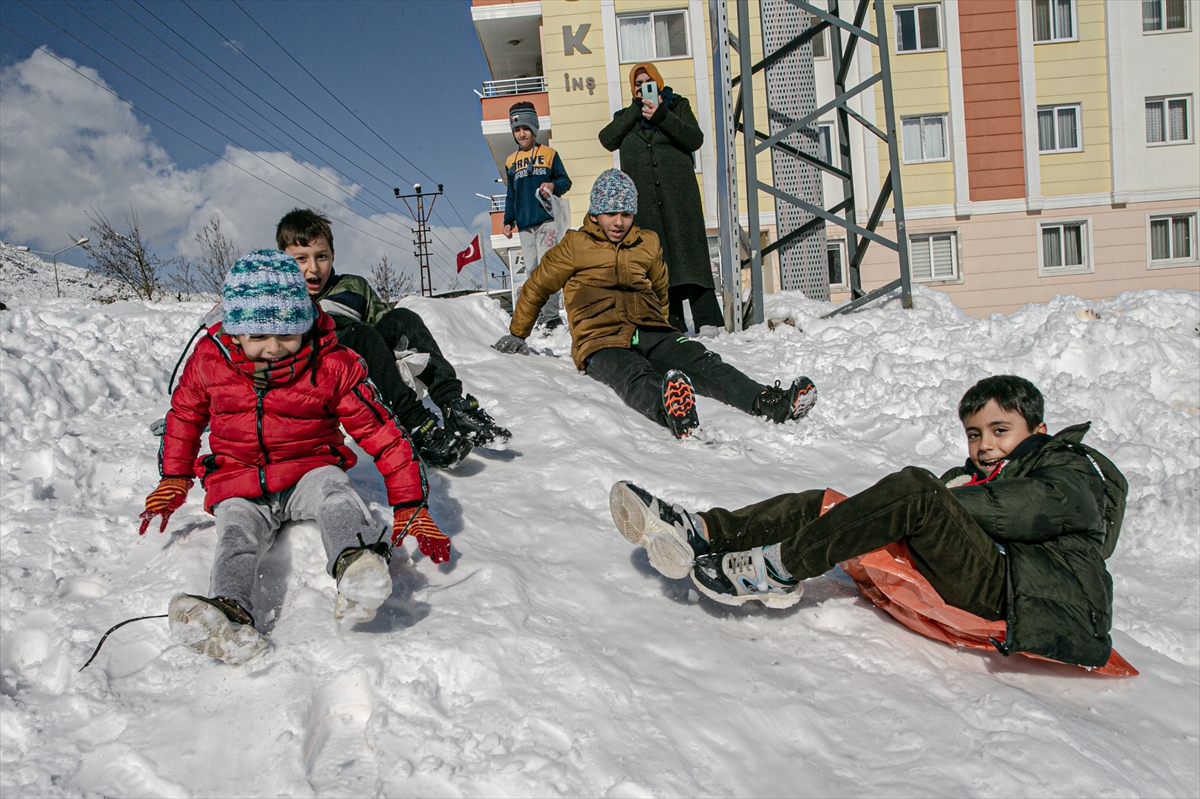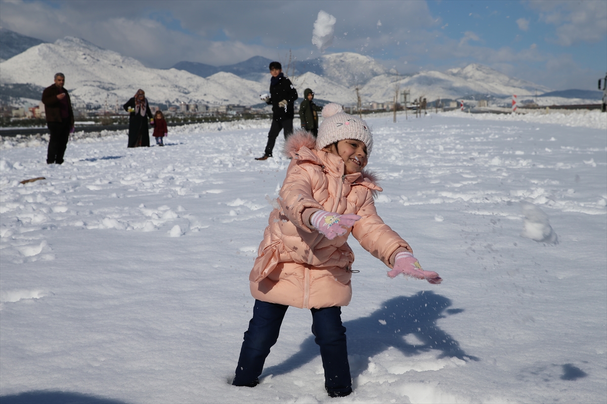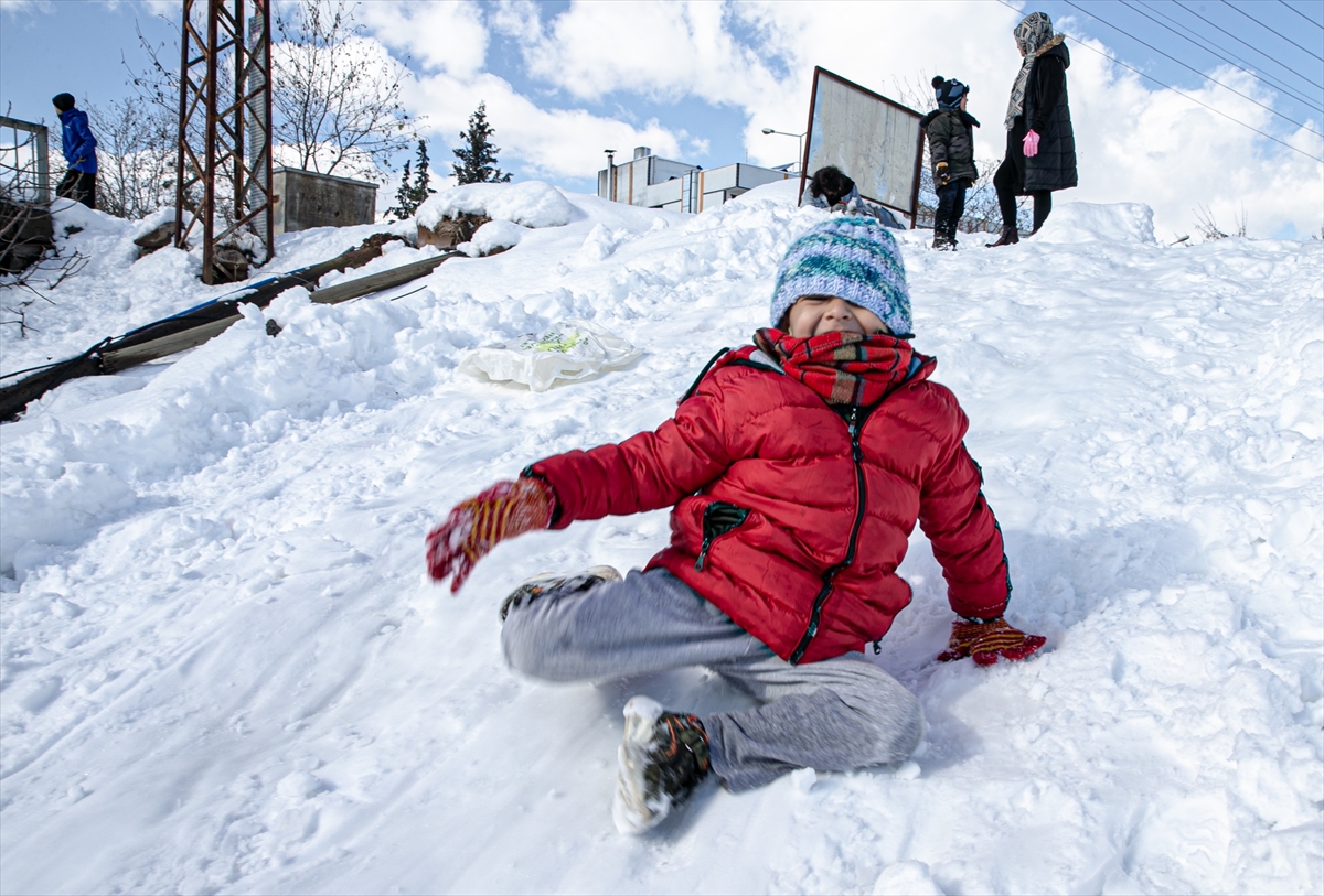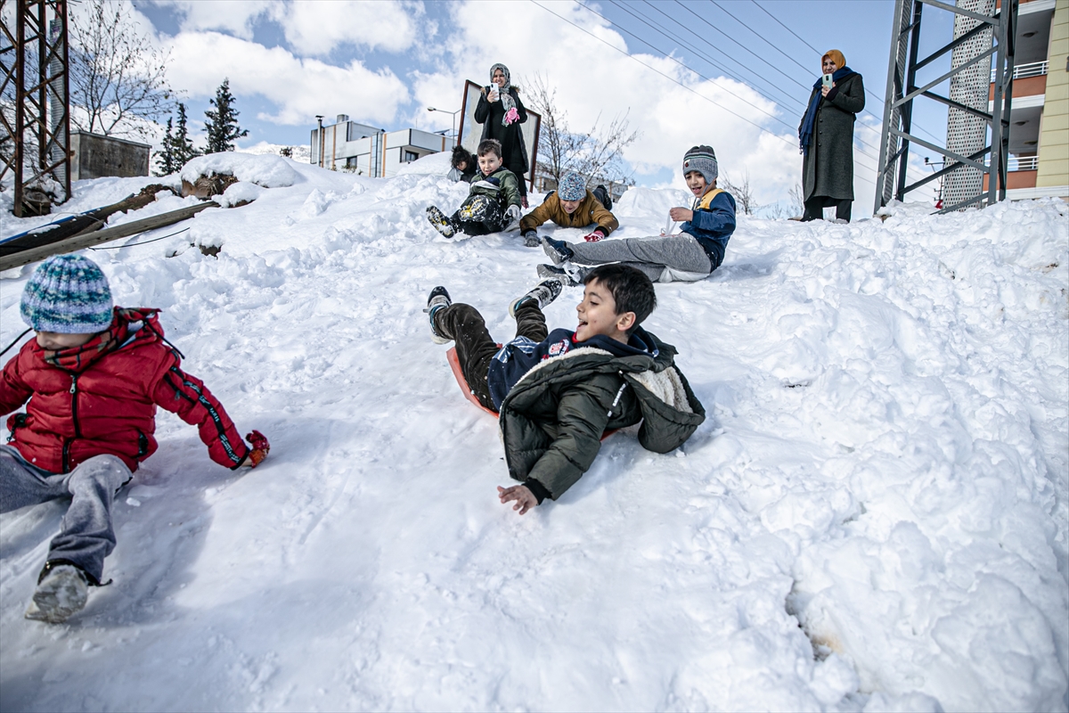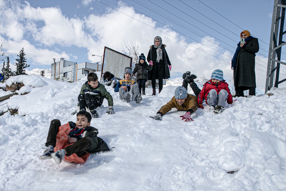 HATAY (AA) – Hatay'da olumsuz hava koşulları nedeniyle okulların tatil edilmesini fırsata çeviren çocuklar, karın tadını çıkardı.