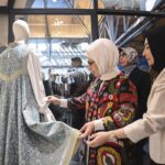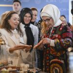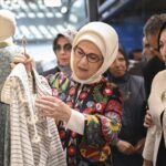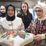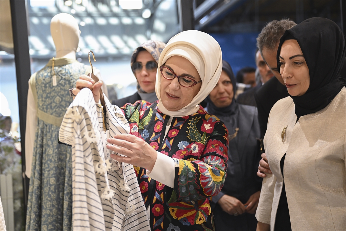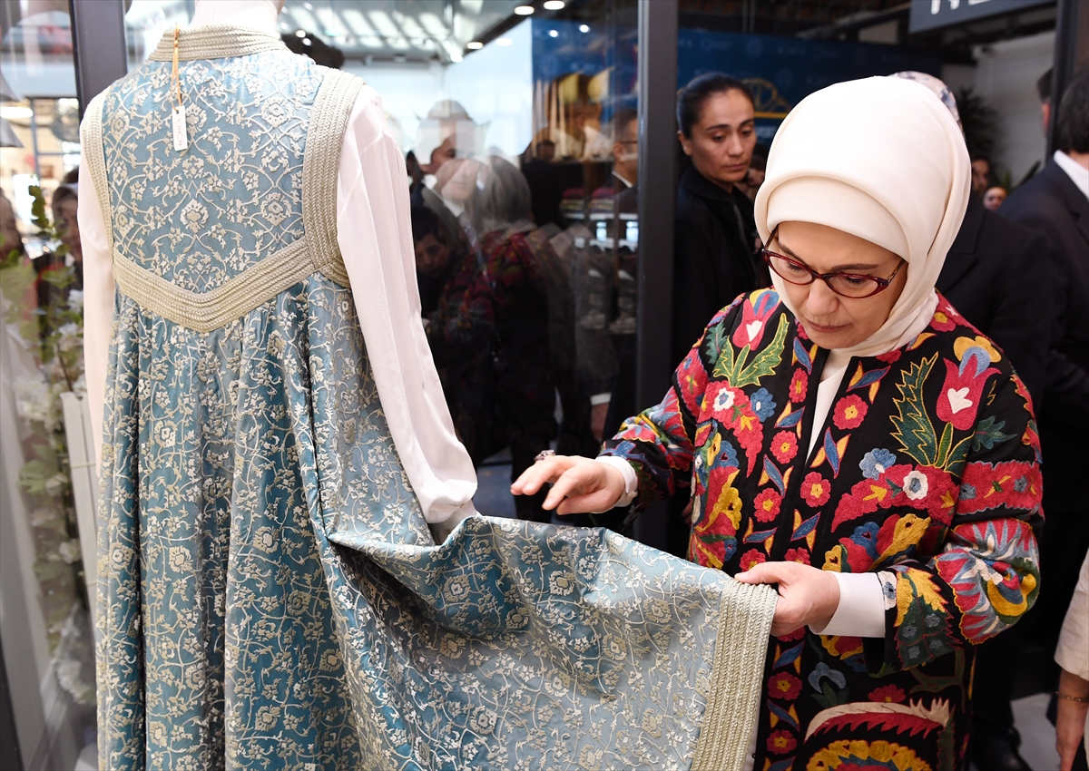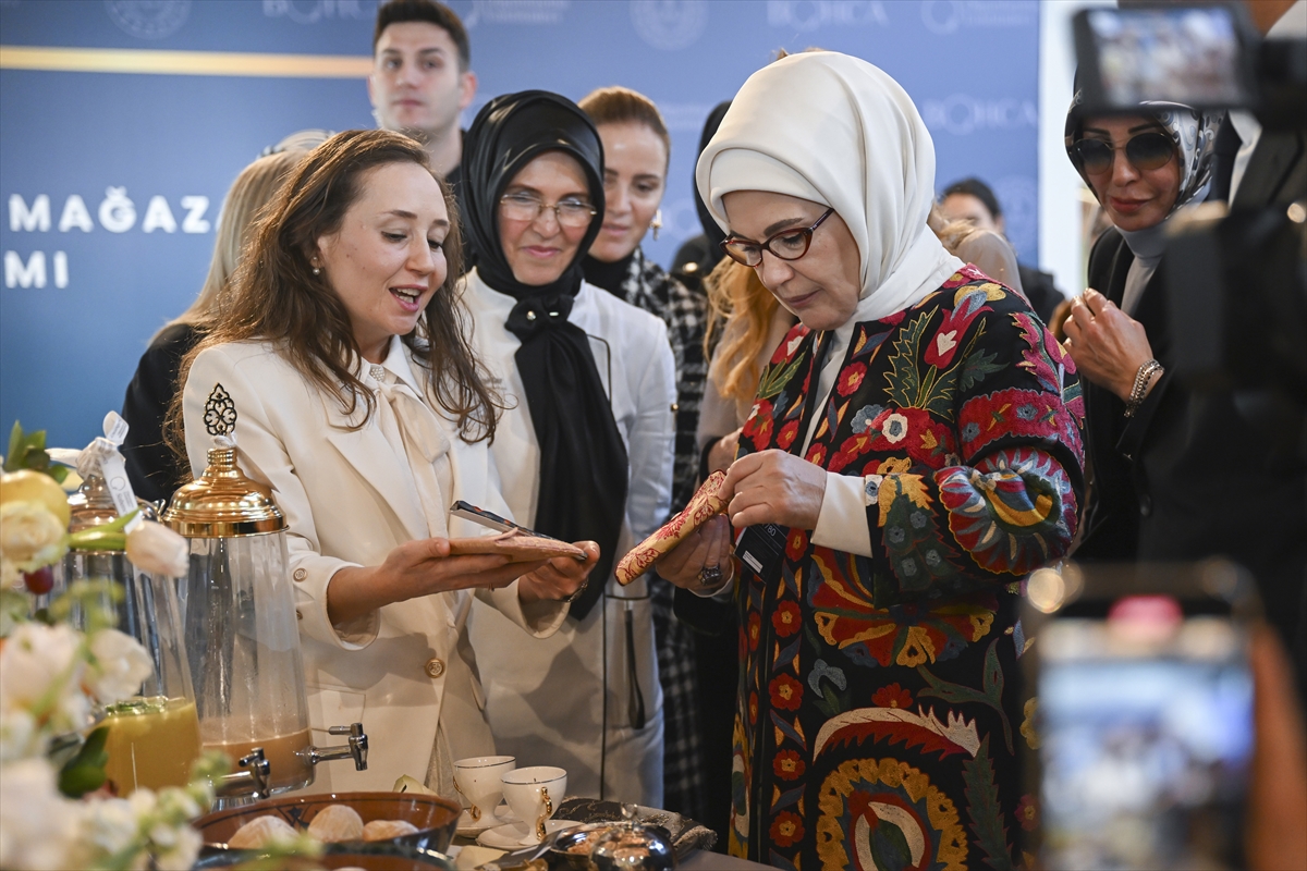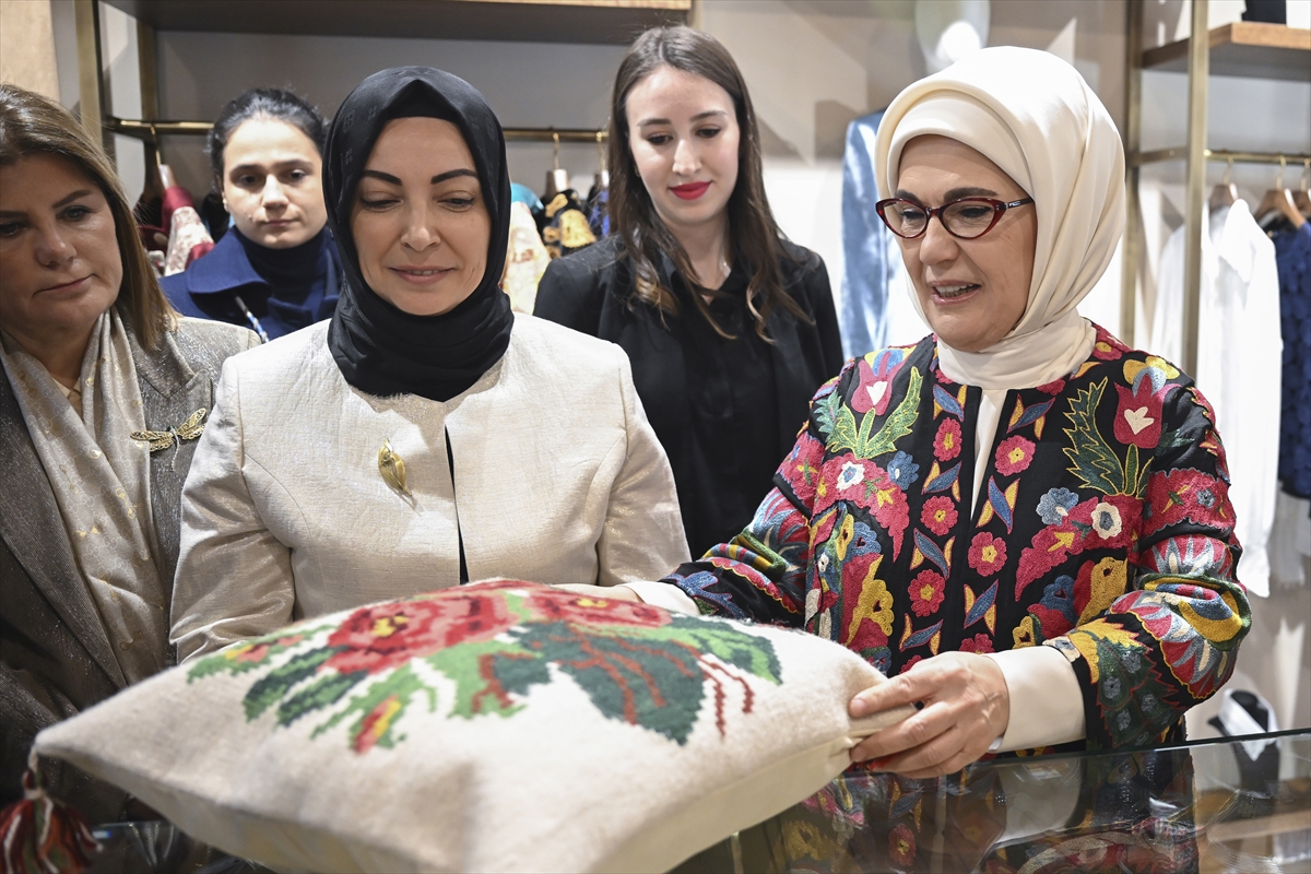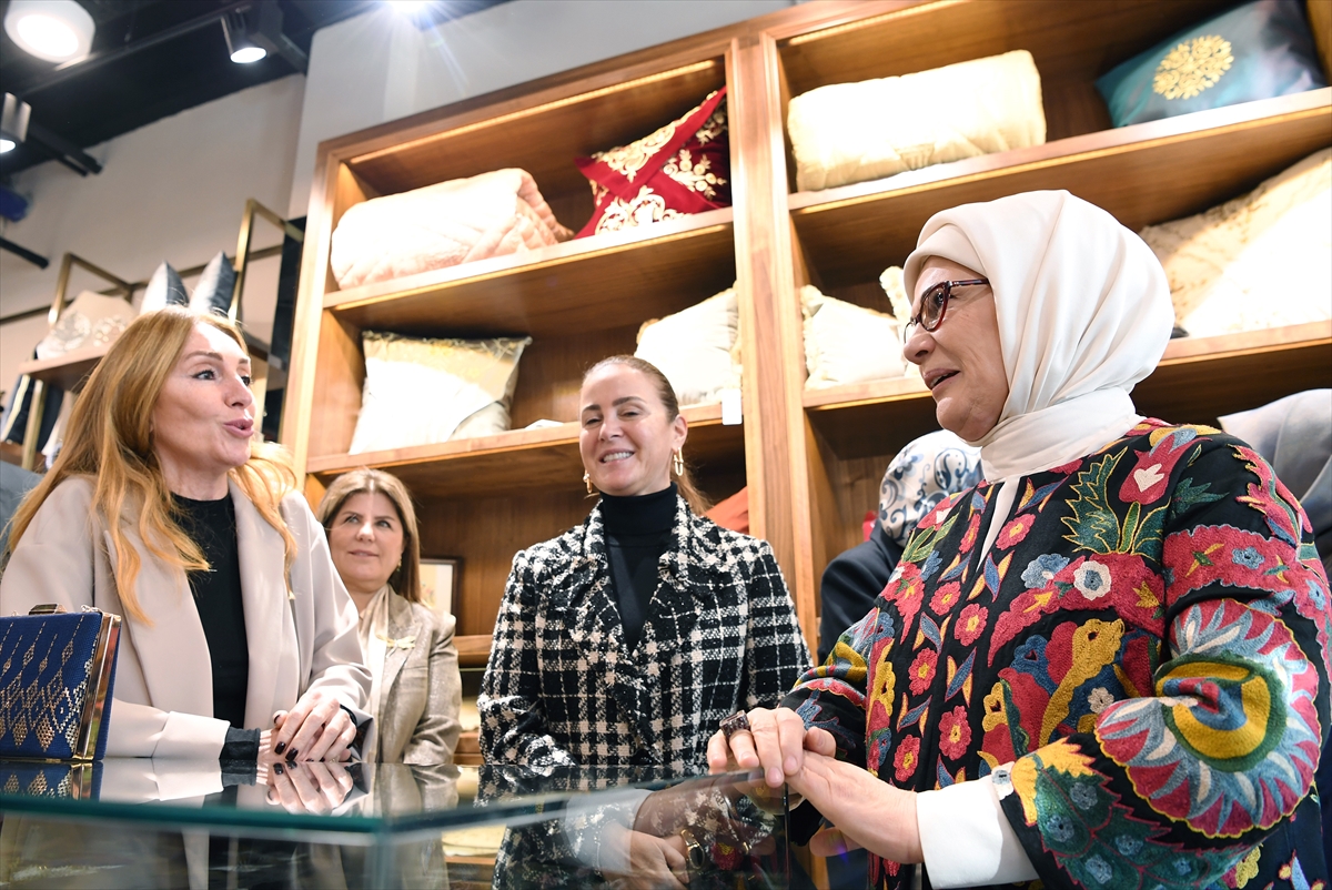 Emine Erdoğan, mağazadaki Maraş işi, Türk işi, Antep işi, blonya iğnesi, dantel angles, hesap işi, tel kırma, tel sarma, sim sarma gibi geleneksel el sanatları teknikleriyle hazırlanan çeyizlik ve ev dekorasyon ürünlerinin yapım teknikleriyle ilgili usta öğreticilerden bilgi aldı.