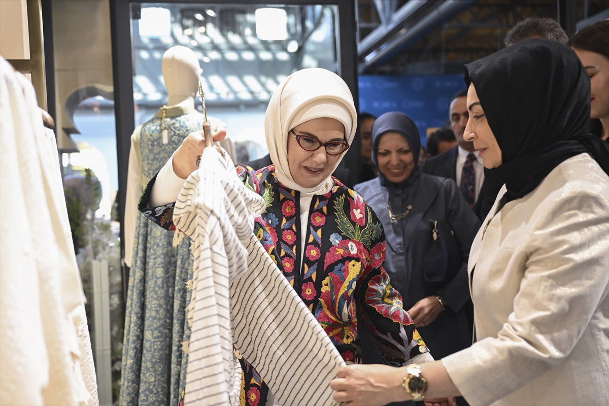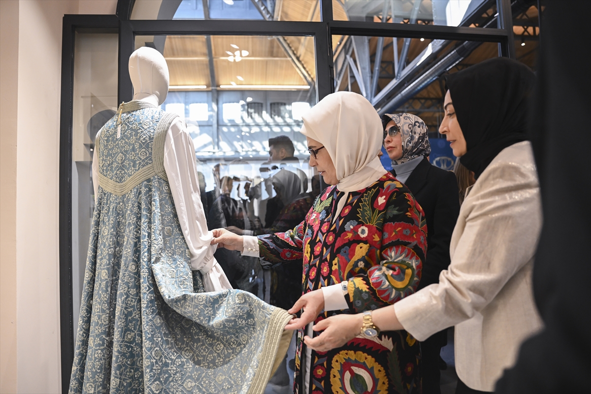 Açılışı yapılan Beyoğlu Refia Övüç Olgunlaşma Enstitüsü bünyesinde hayata geçirilen Bohça mağazasını gezen Erdoğan, el dokuması ipek ile pamuk karışımı kumaşlarla hazırlanan ve geleneksel el sanatlarıyla bezenen kıyafetleri inceledi.