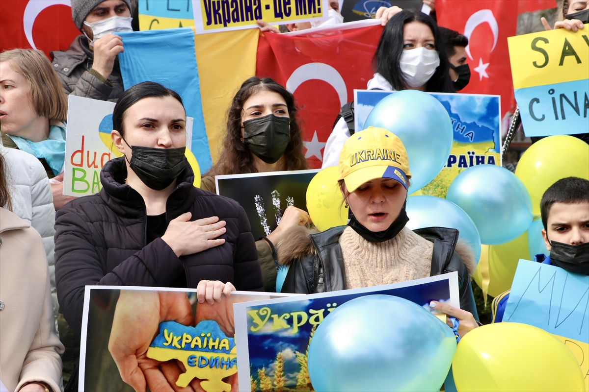 Sloganlarla Rusya'nın saldırılarını kınayan grup, İstiklal Marşı ve Ukrayna Milli Marşı'nı okuduktan sonra dağıldı.