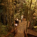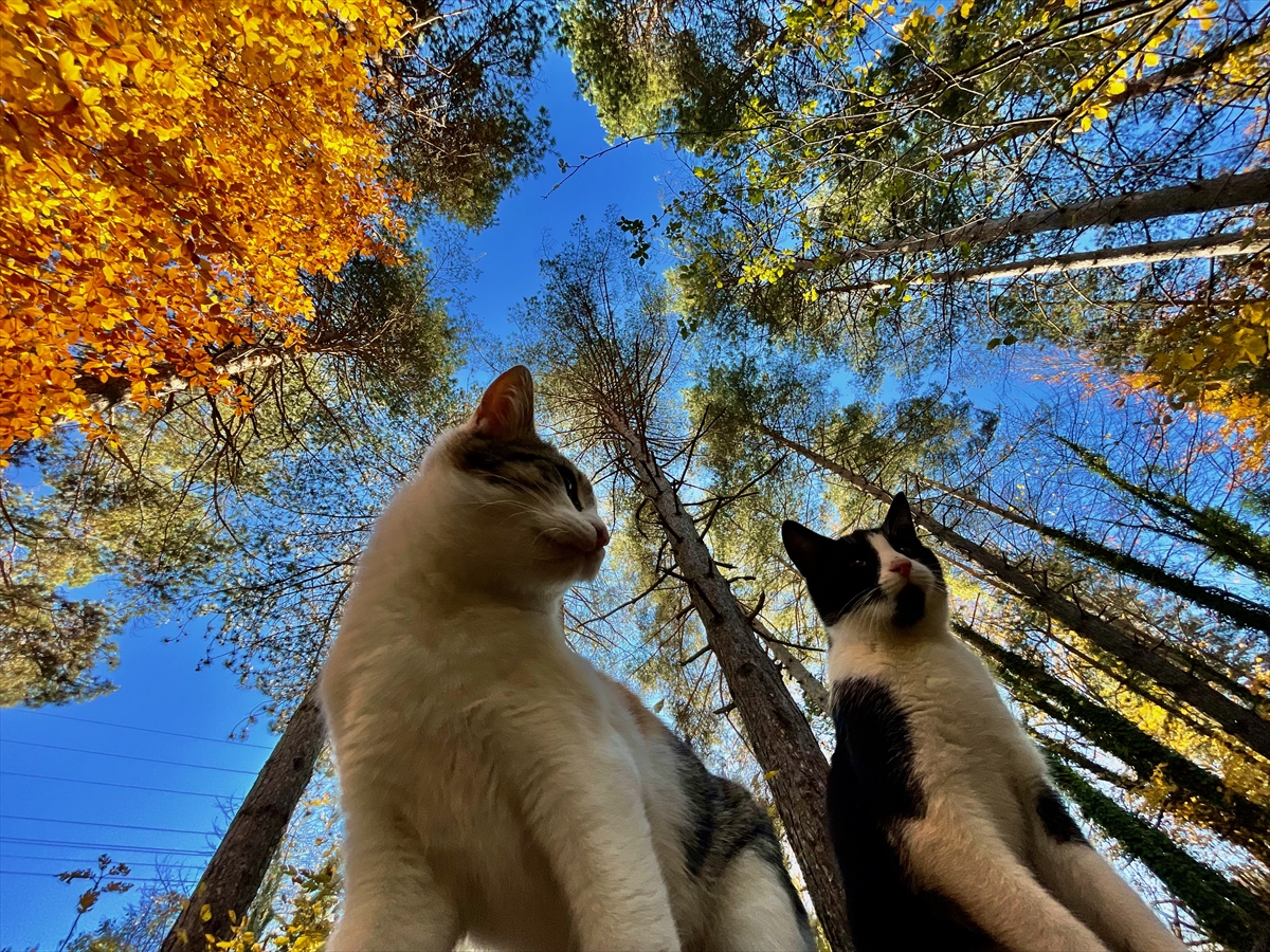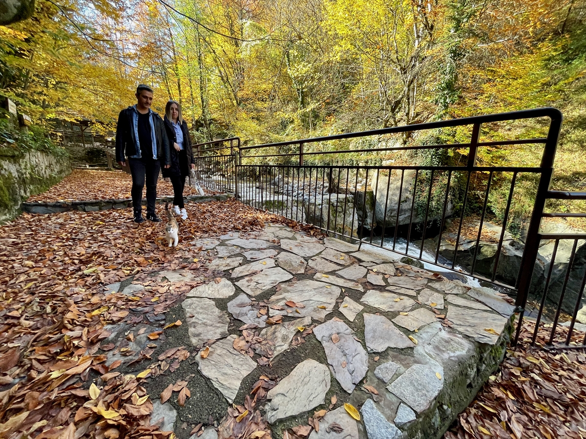 Ziyaretçiler, sarı, kahverengi ve kırmızı yapraklar arasında doğa yürüyüşü yaparak keyifli vakit geçiriyor.