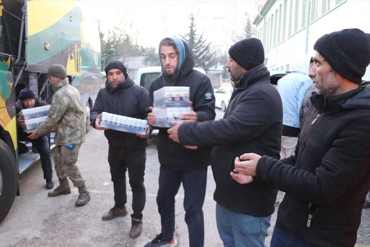 Arama kurtarma çalışmalarının yoğun bir şekilde sürdüğü Adıyaman'daki Besni Şehit Eren Kupal Mesleki ve Teknik Anadolu Lisesi önüne konuşlanan takım otobüsü, buradaki depremzedelere yardımı teslim etti.