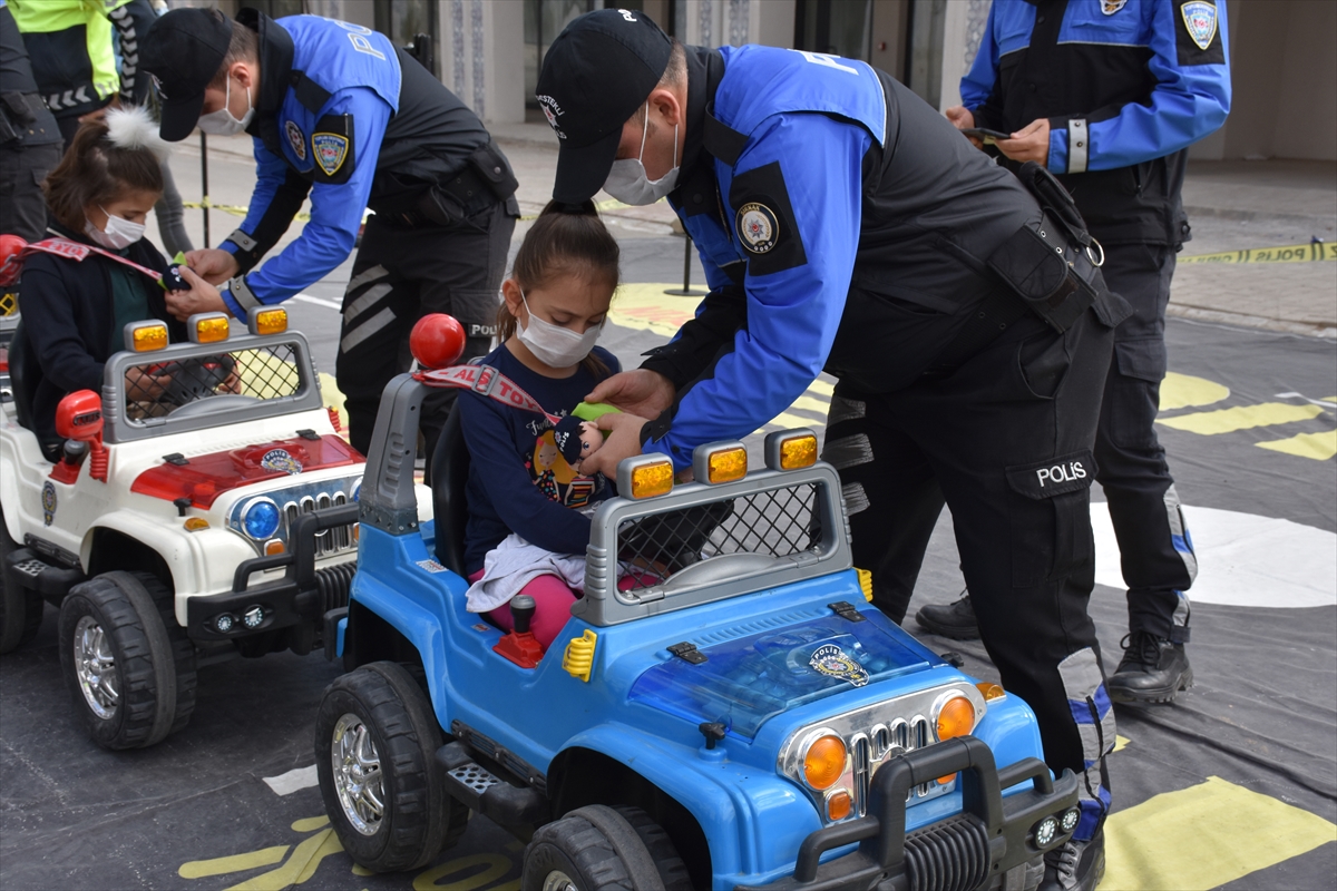 Polis ekiplerince, öğrencilere kırmızı düdük dağıtıldı, trafik kuralları anlatıldı.