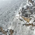 Yine vadide yer alan Sümela Manastırı ve beyaza bürünen ormanlarla ortaya çıkan manzara dron ile görüntülendi.