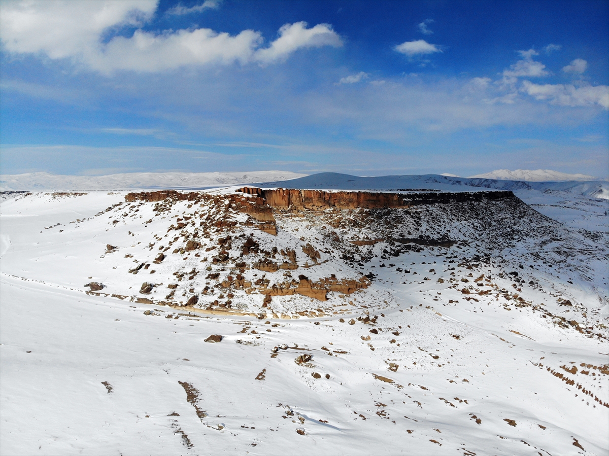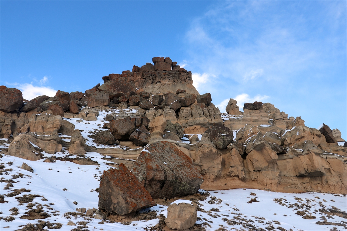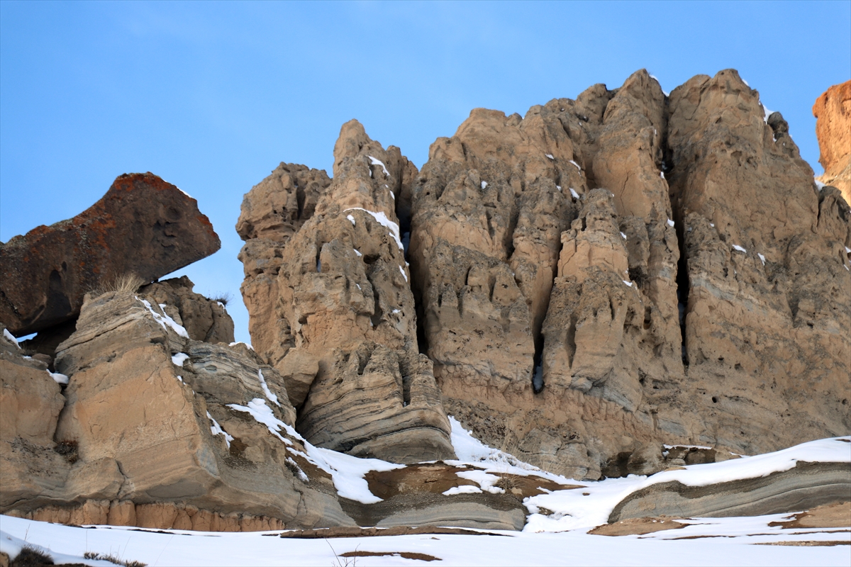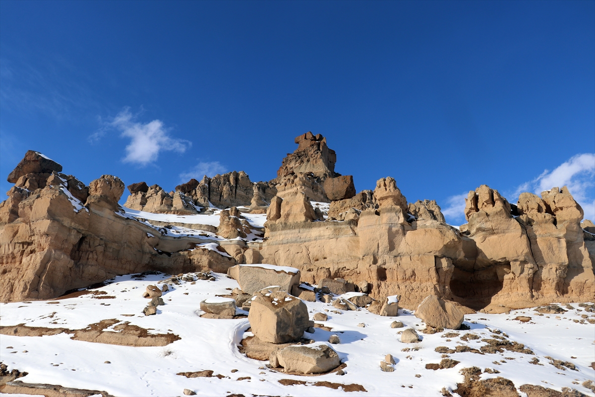 AĞRI (AA) – Ağrı'nın Diyadin ilçesindeki tarihi Meya Antik Kenti ve çevresinde oluşan peribacaları, kar yağışlarıyla ayrı güzelliğe büründü.
