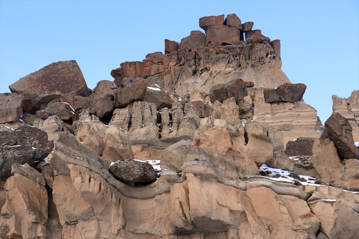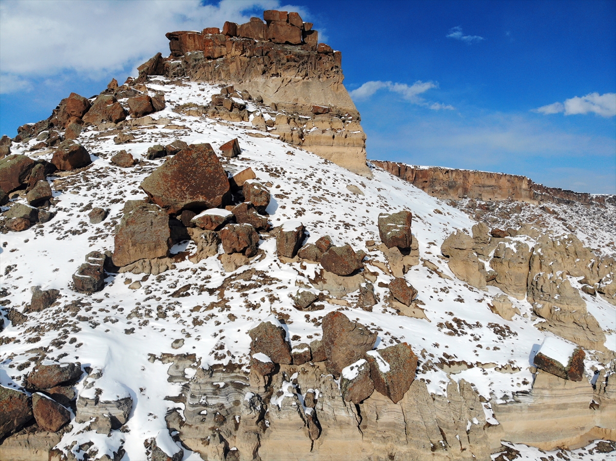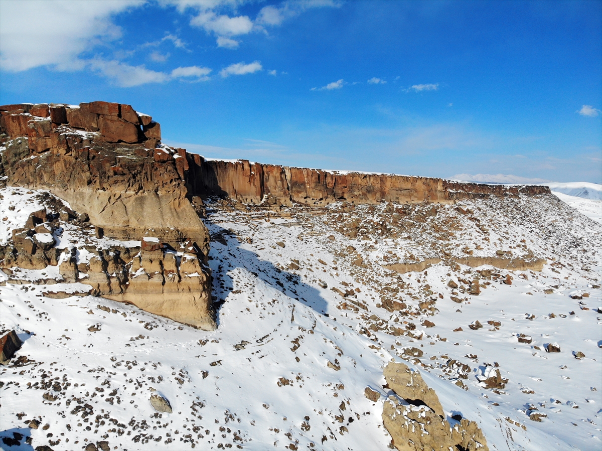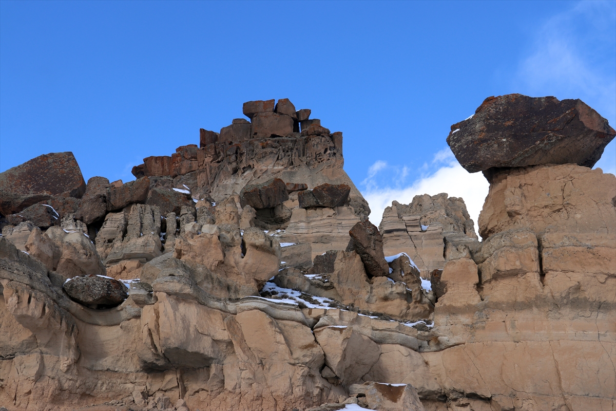 AĞRI (AA) – Ağrı'nın Diyadin ilçesindeki tarihi Meya Antik Kenti ve çevresinde oluşan peribacaları, kar yağışlarıyla ayrı güzelliğe büründü.