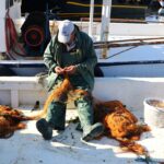 Balıkçılar denizden döndükten sonra limanda ağlarının onarımını yapıyor.