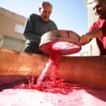 Mahalleye getirilen narlar, kadınlar tarafından değneklerle dövülerek taneleri çıkartılıyor ardından çuvallara konularak küçük havuzun içinde suyu çıkartılıyor.