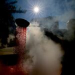 Dev kazanlara aktarılan nar suyu, binbir emek ve zahmetle, saatlerce süren kaynamanın ardından kıvama geldikten sonra soğuması için bidonlara aktarılıyor.