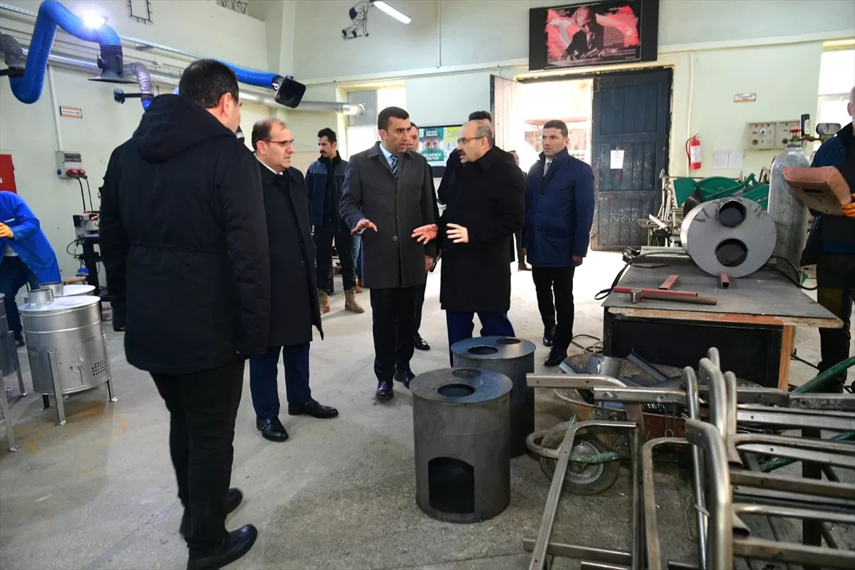 Depremden etkilenen iller için öğretmen ve öğrencilerce soba yapılan Ortahisar Mesleki Teknik Anadolu Lisesi Atölyesi'ne de ziyaret gerçekleştiren Vali Ustaoğlu'na, İl Milli Eğitim Müdürü Burak Fettahoğlu tarafından üretime ilişkin bilgi verildi.