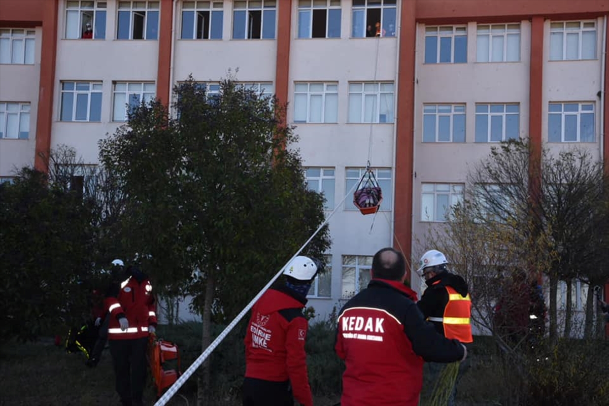 Senaryo gereği ekipler, araçlarıyla okulun bahçesine konuşlandı. Sirenlerin çalmasıyla bina içindekiler hızlı şekilde tahliye edildi.