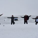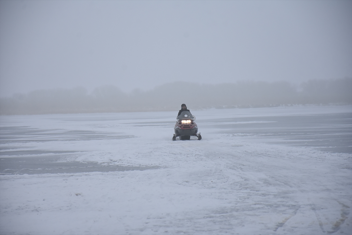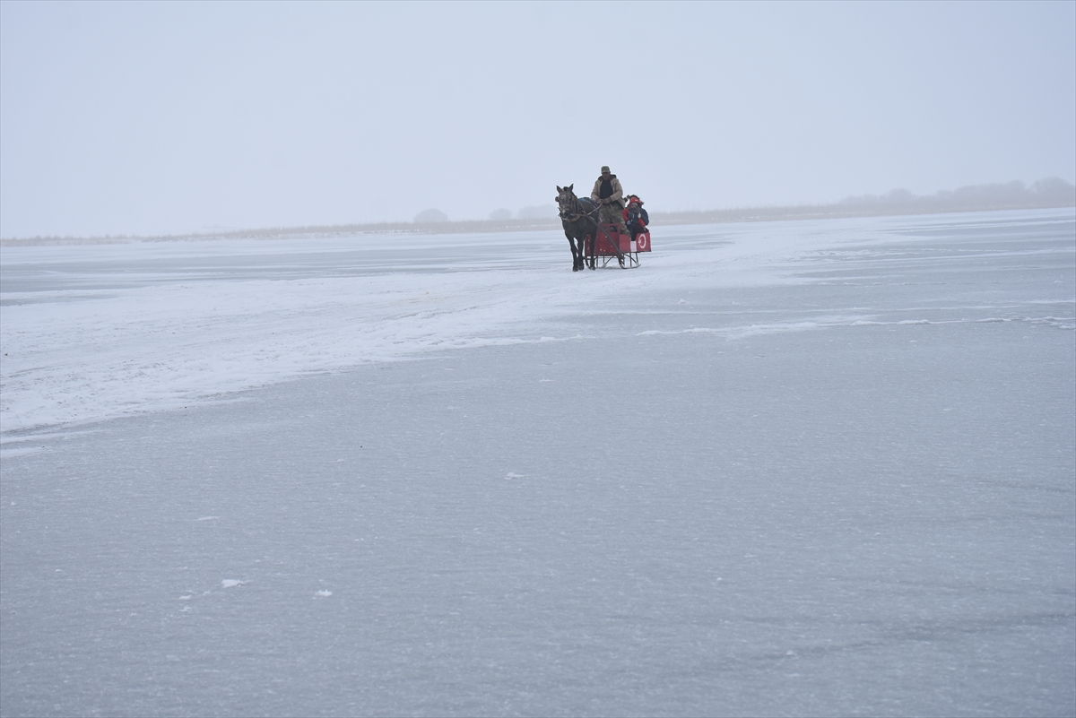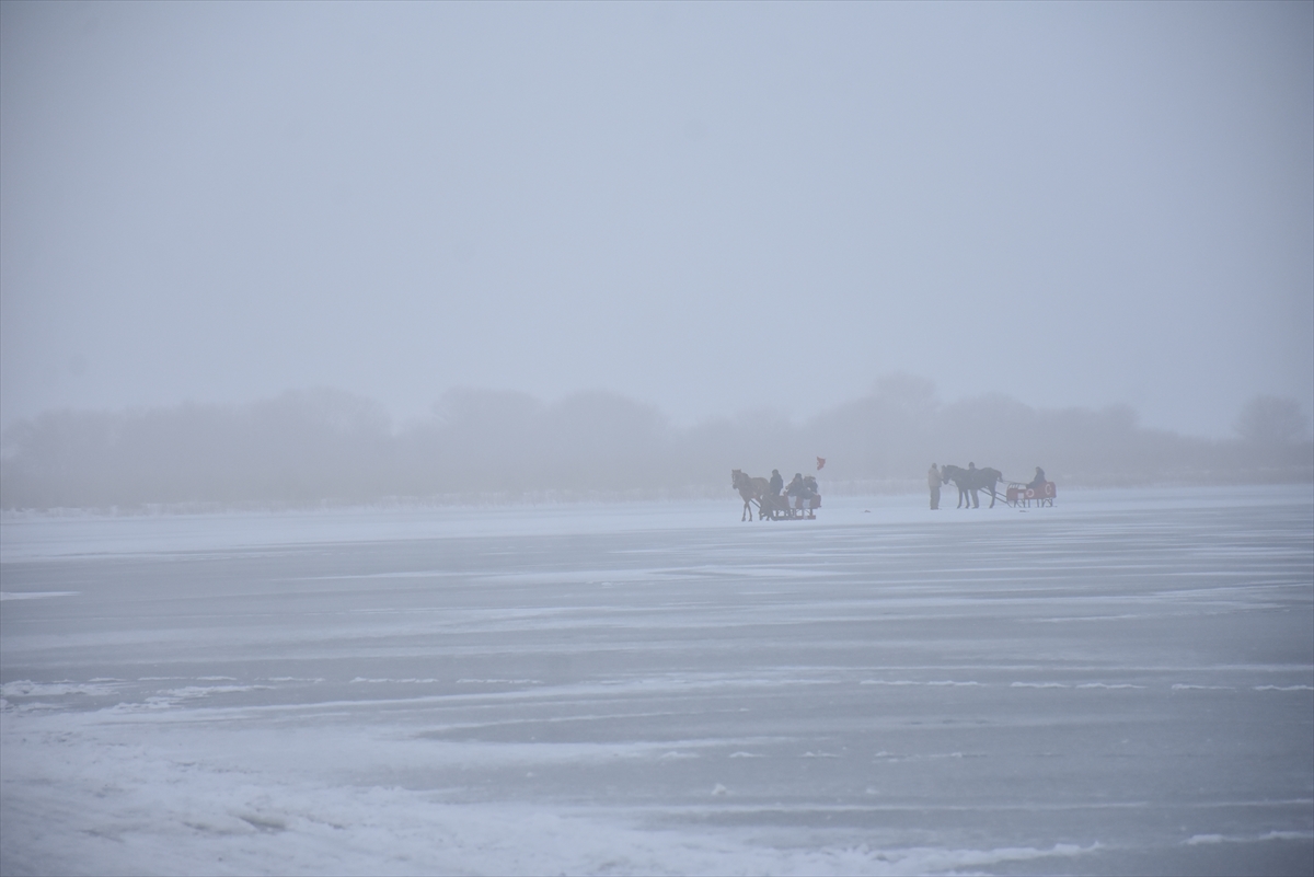 Kış mevsiminde yüzeyi tamamen buzla kaplanan Kars-Ardahan sınırındaki gölün Arpaçay ilçesine bağlı Taşbaşı köyü mevkisi soğuk ve sise rağmen yerli ve yabancı turistleri ağırladı.