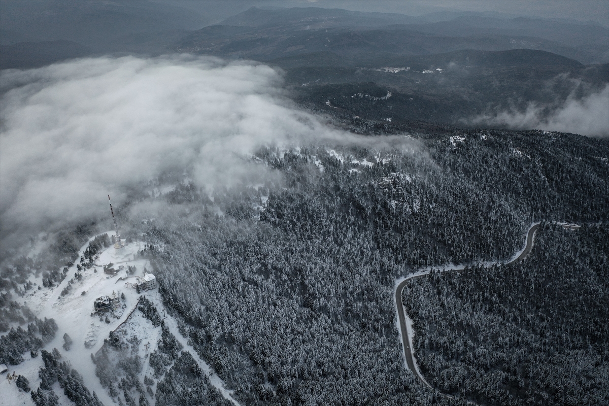 BURSA (AA) – Türkiye'nin kayak ve kış turizminin önemli merkezlerinden Uludağ, kar yağışları ve sis altında dronla görüntülendi.