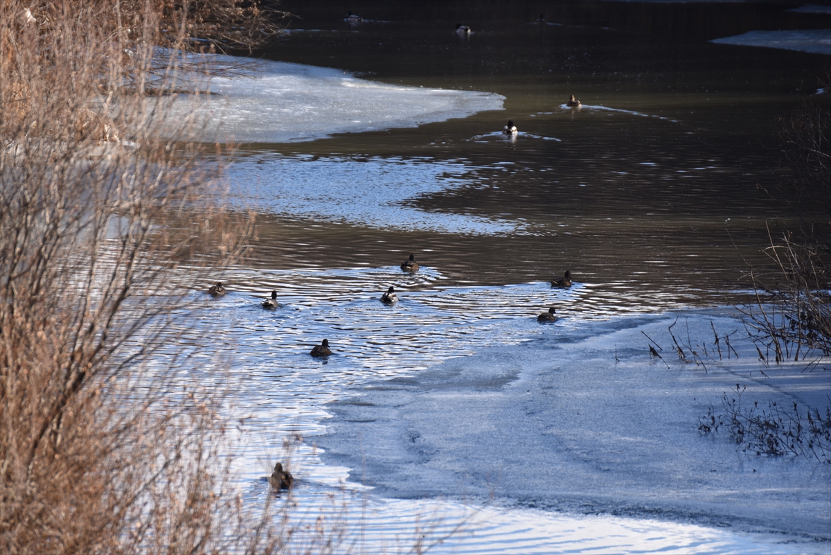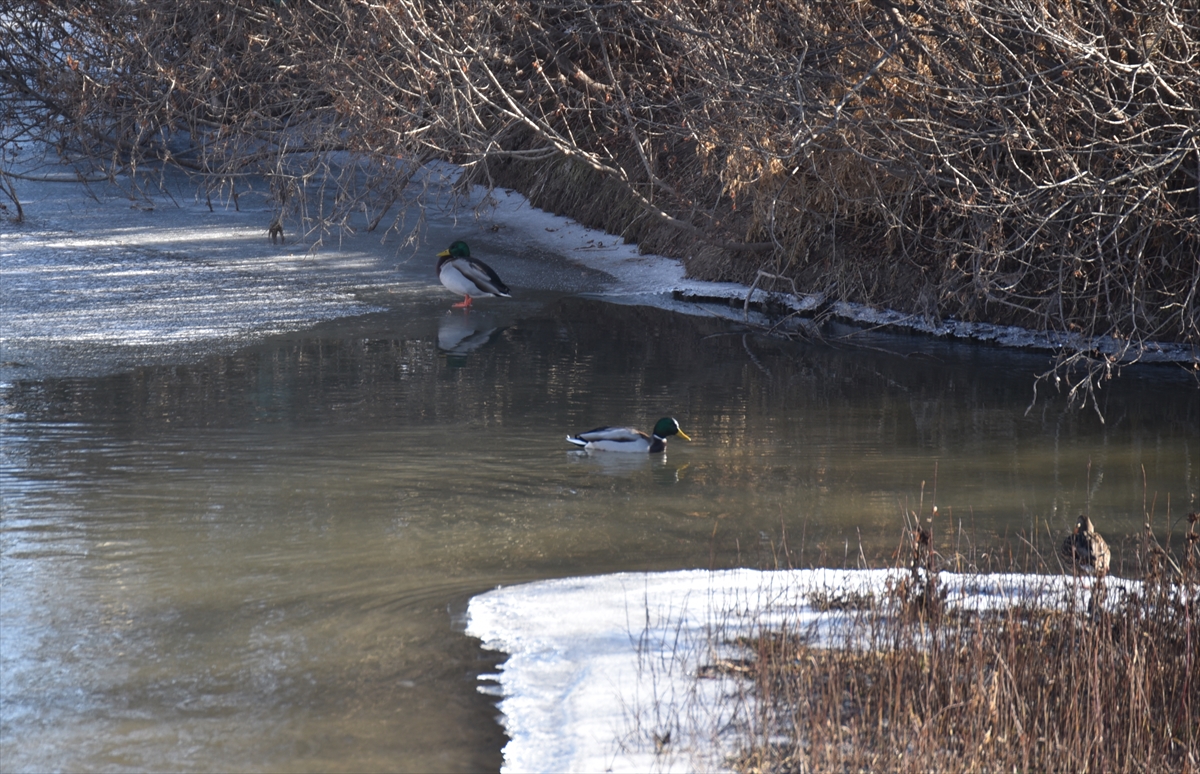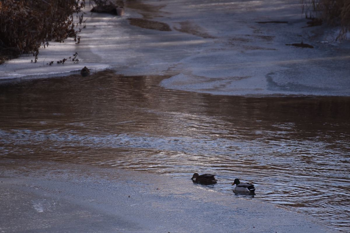 KARS (AA) – Kars'ta soğuk havanın etkisiyle kısmen buzla kaplanan Kars Çayı'nda yeşilbaş ördekler yiyecek ararken görüldü.