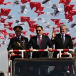 Cumhuriyet Alanı'nda devam eden programda Vali Toros, Tuğamiral Yücel Darcan ve Büyükşehir Belediye Başkanı Vahap Seçer, tören aracıyla katılımcıların bayramını kutladı.