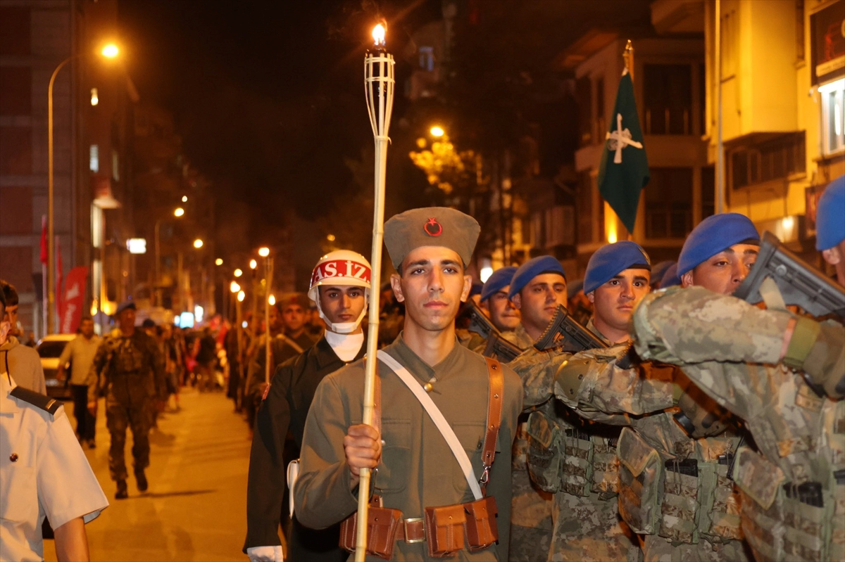 Kurtuluş Caddesi'nden 41'inci Komando Tugay Komutanlığı Birlikleri ve Deniz Kuvvetleri Komutanlığı Bandosu eşliğinde başlayan fener alayında vatandaşlar, ellerinde Türk bayrakları ve meşalelerle, Anıtpark'a kadar yürüdü.