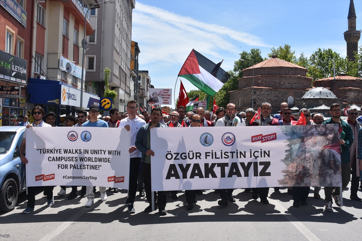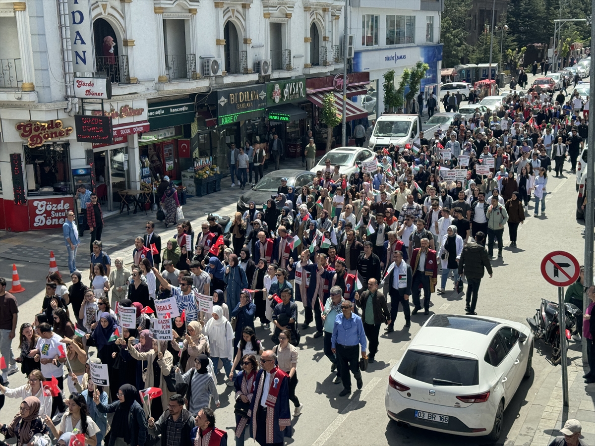İmaret Camisi önünde buluşan Afyon Kocatepe Üniversitesi (AKÜ) ile Afyonkarahisar Sağlık Bilimleri Üniversitesi (AFSÜ) akademisyen ve öğrencileri, ellerinde pankartlar ve dövizlerle İsrail aleyhine sloganlar atarak Zafer Meydanı'na yürüdü.