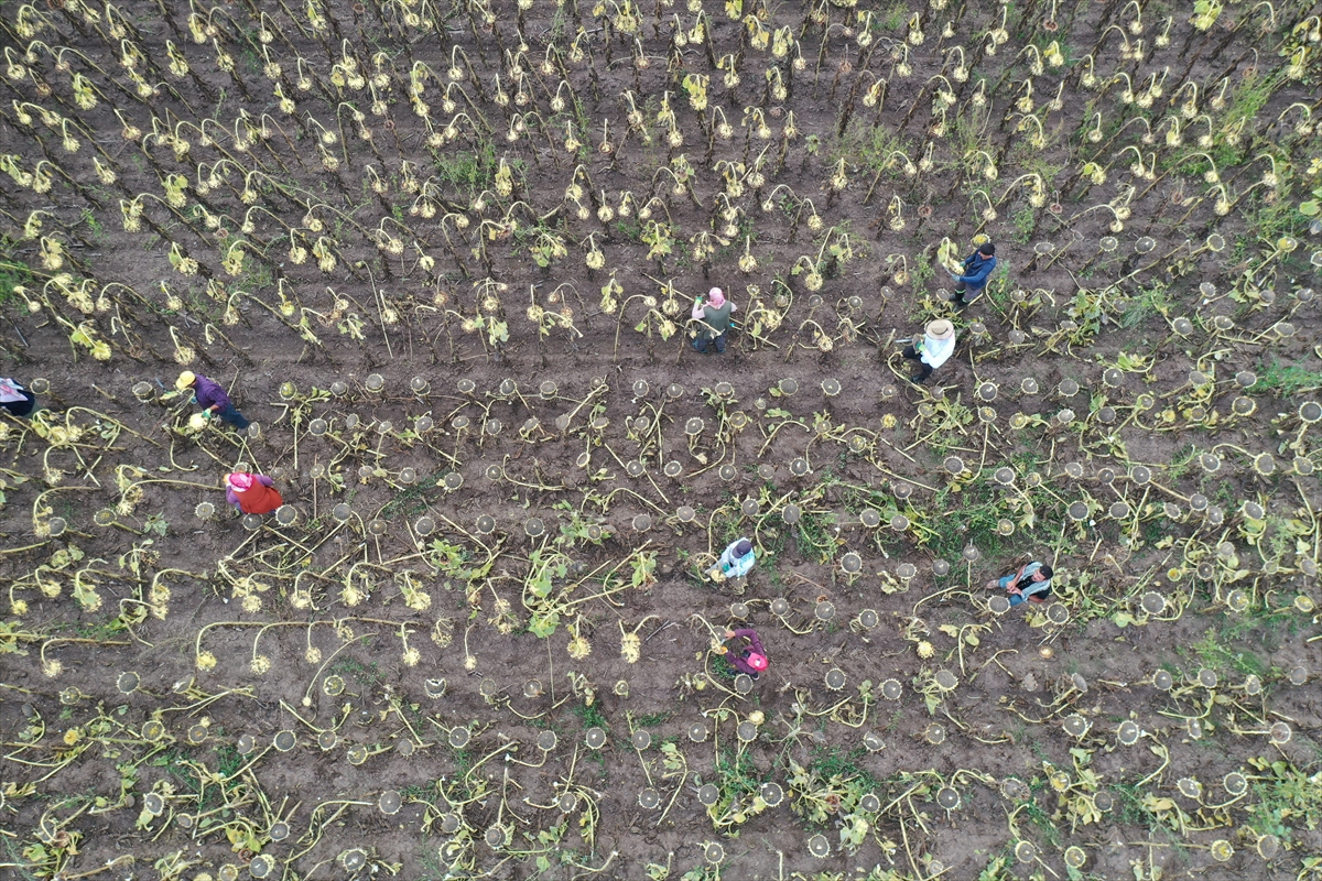 AĞRI (AA) – Zengin su kaynaklarına sahip Ağrı Ovası'nın binlerce dönümlük tarlalarında yetiştirilen çerezlik ayçiçeği, Şanlıurfa'dan gelen mevsimlik tarım işçileri tarafından hasat ediliyor.