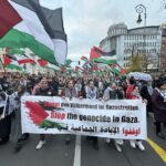 Buradan yürüyüşe geçen göstericiler, Filistin ve Lübnan bayrakları ile "Bu, sömürgecilik karşıtı bir özgürlük mücadelesidir", "Gazze ve Lübnan'dan elinizi çekin", "Bugün kimse 'ben bilmiyordum' diyemez" ve "Gazze'de soykırımı durdurun" yazan döviz ve pankartlar taşıdı.