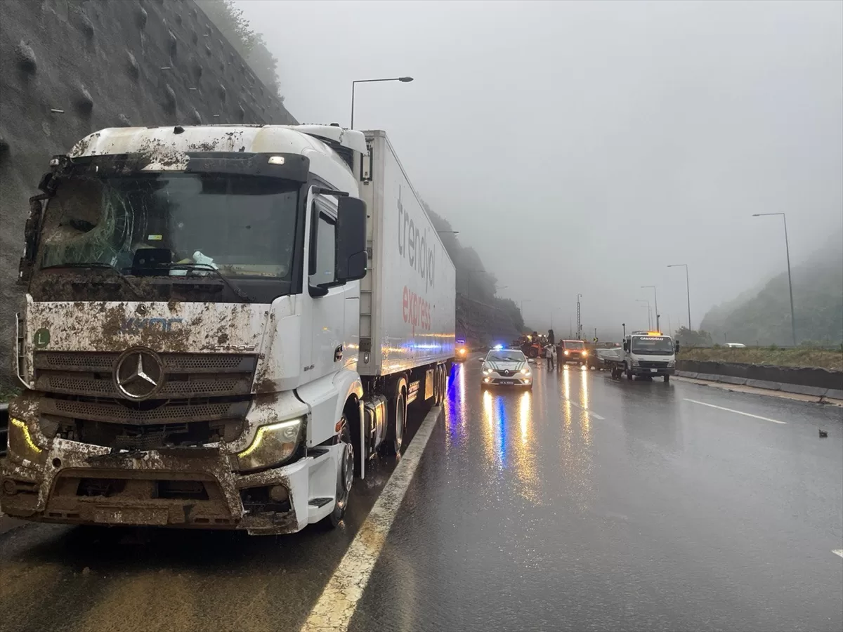 BOLU (AA) – Anadolu Otoyolu Bolu geçişinde dağ yamacından kopan kayaların tıra çarpması sonucu zincirleme trafik kazası meydana geldi.