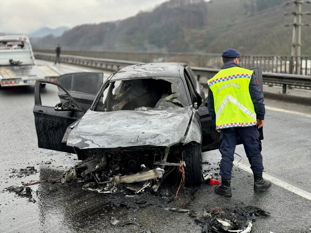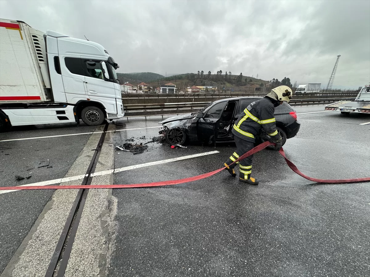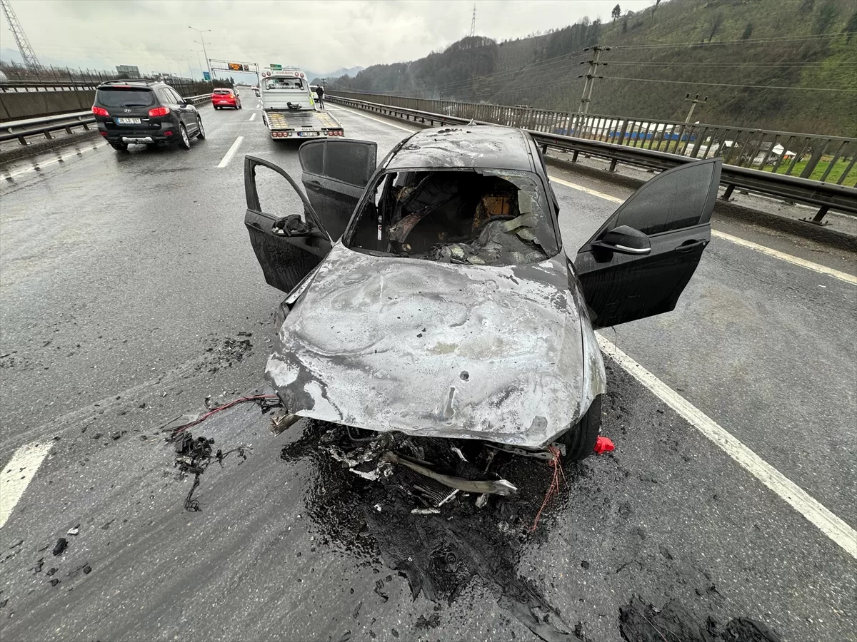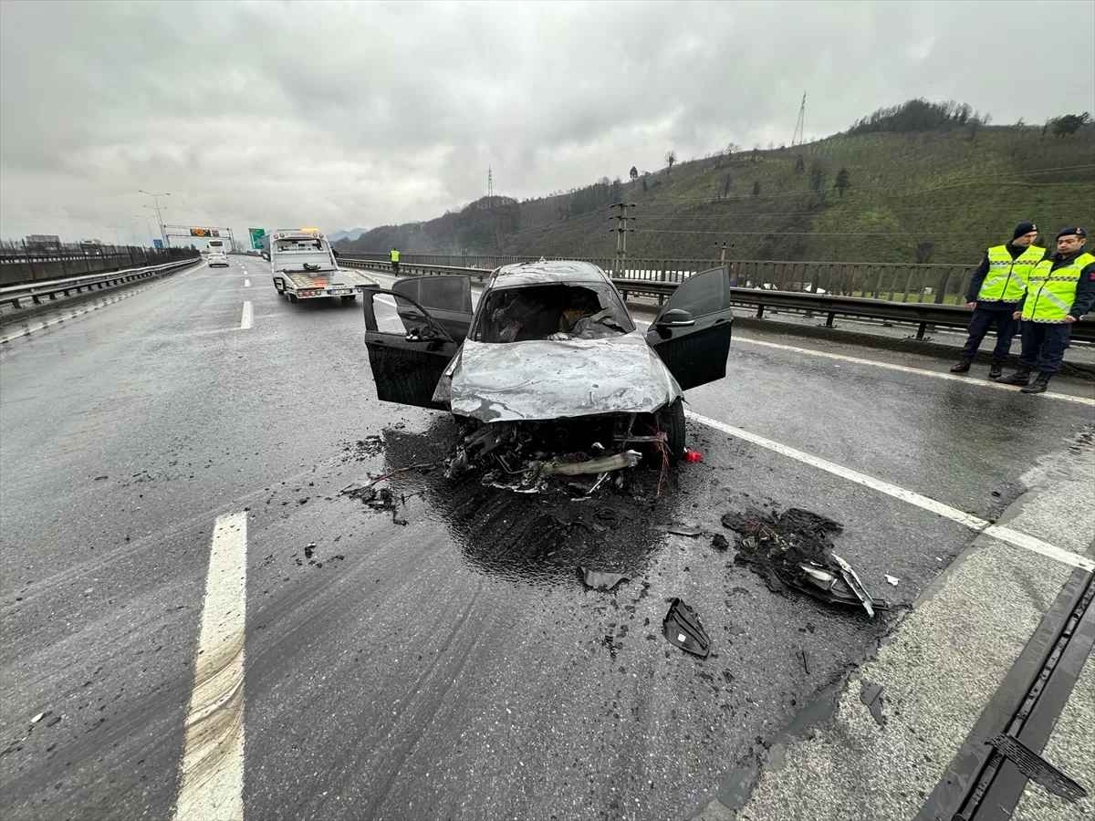 DÜZCE (AA) – Anadolu Otoyolu'nun Düzce kesiminde meydana gelen kazanın ardından yangın çıkan otomobil kullanılmaz hale geldi.