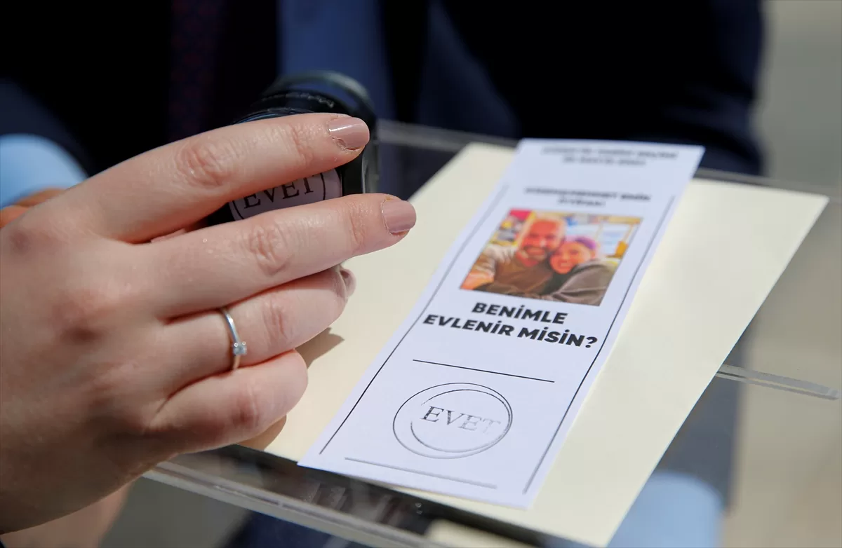 Esin'in "evet" cevabının ardından Özbey, kız arkadaşının parmağına yüzüğü taktı. Esin de "evet" yazan mührü, Özbey ile fotoğrafının bulunduğu oy pusulasına basarak zarfı sandığa attı.
