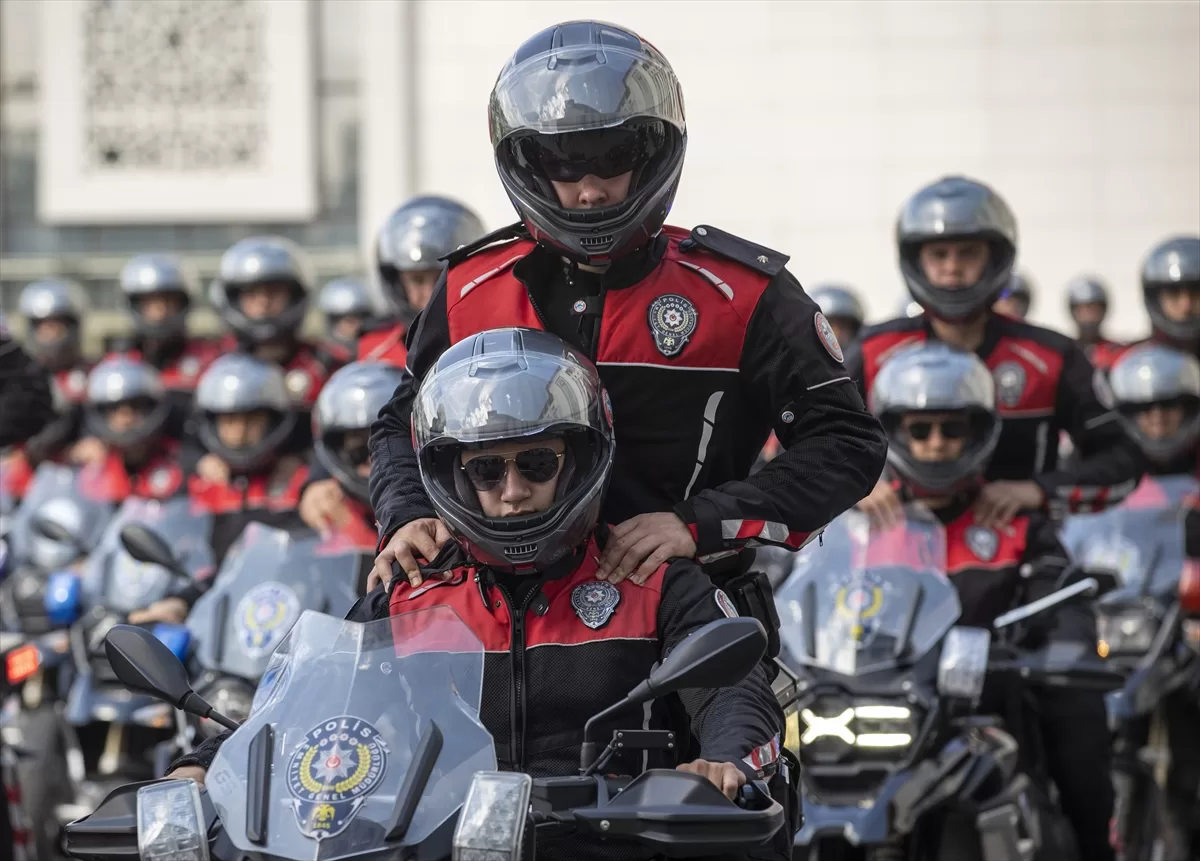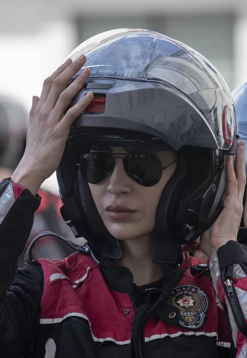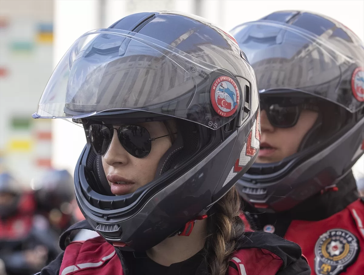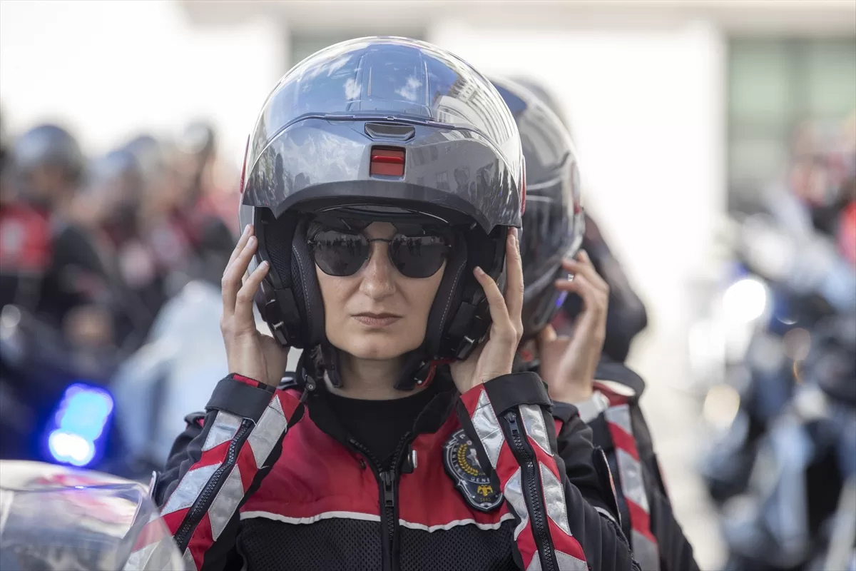 Emniyetin bahçesinde bir araya gelen ekipler, amirlerinin göreve başlama içtiması sonrası, verilen talimatla aynı anda kask giyerek motosikletlerine bindi.