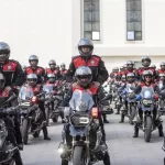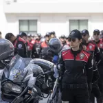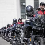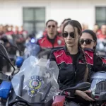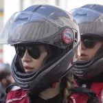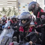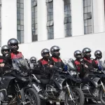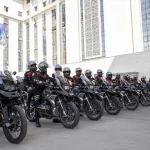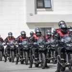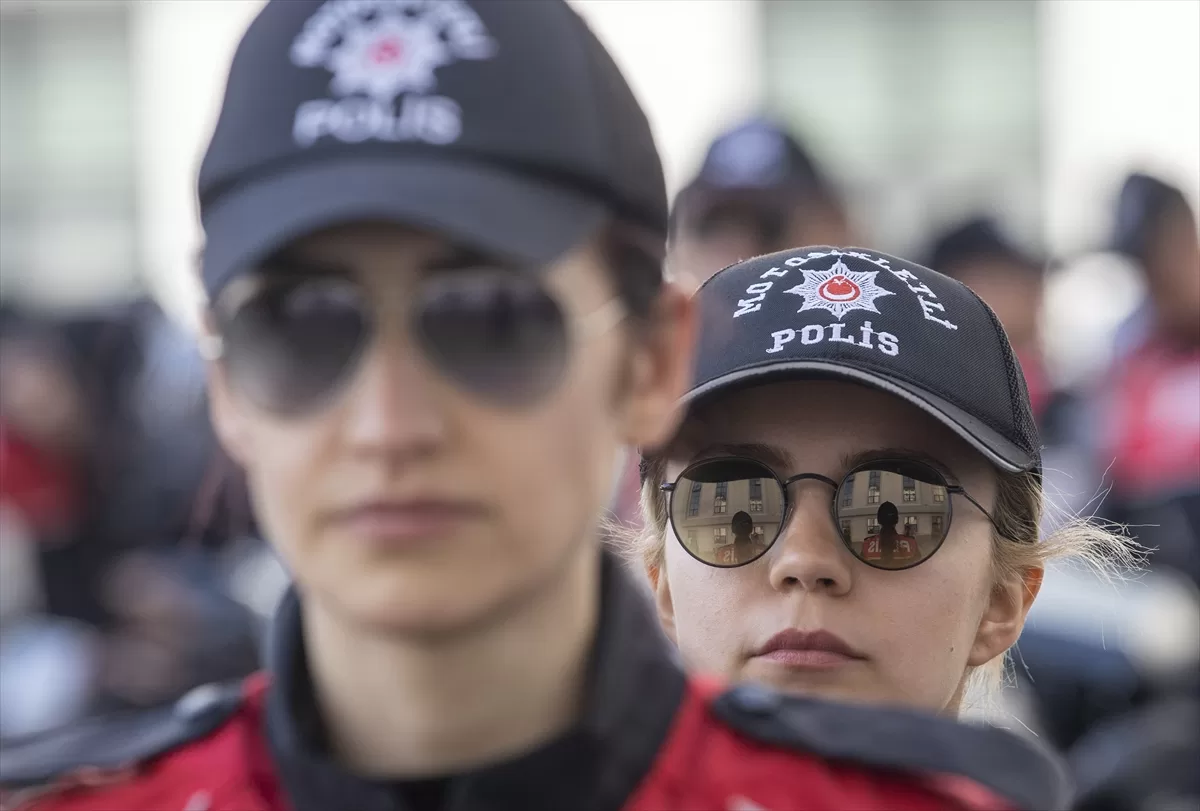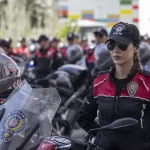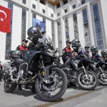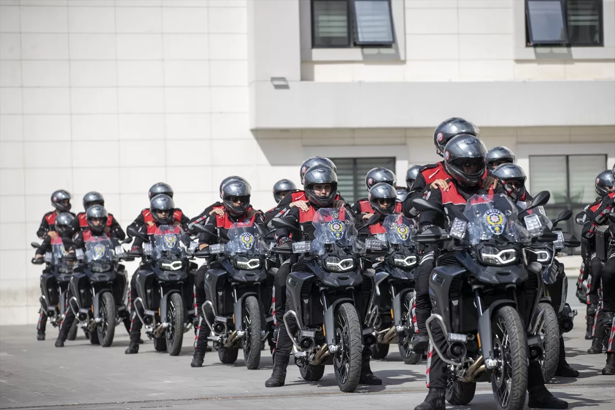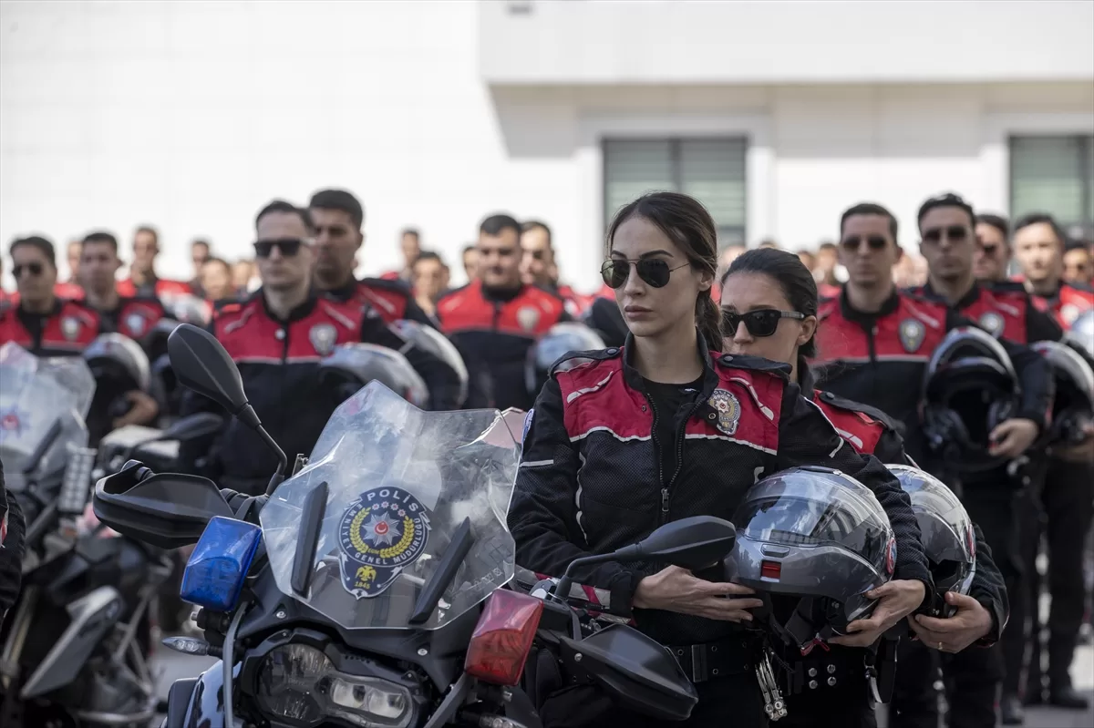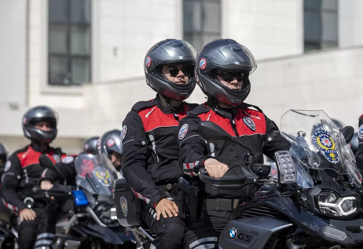 Emniyetin bahçesinde bir araya gelen ekipler, amirlerinin göreve başlama içtiması sonrası, verilen talimatla aynı anda kask giyerek motosikletlerine bindi.