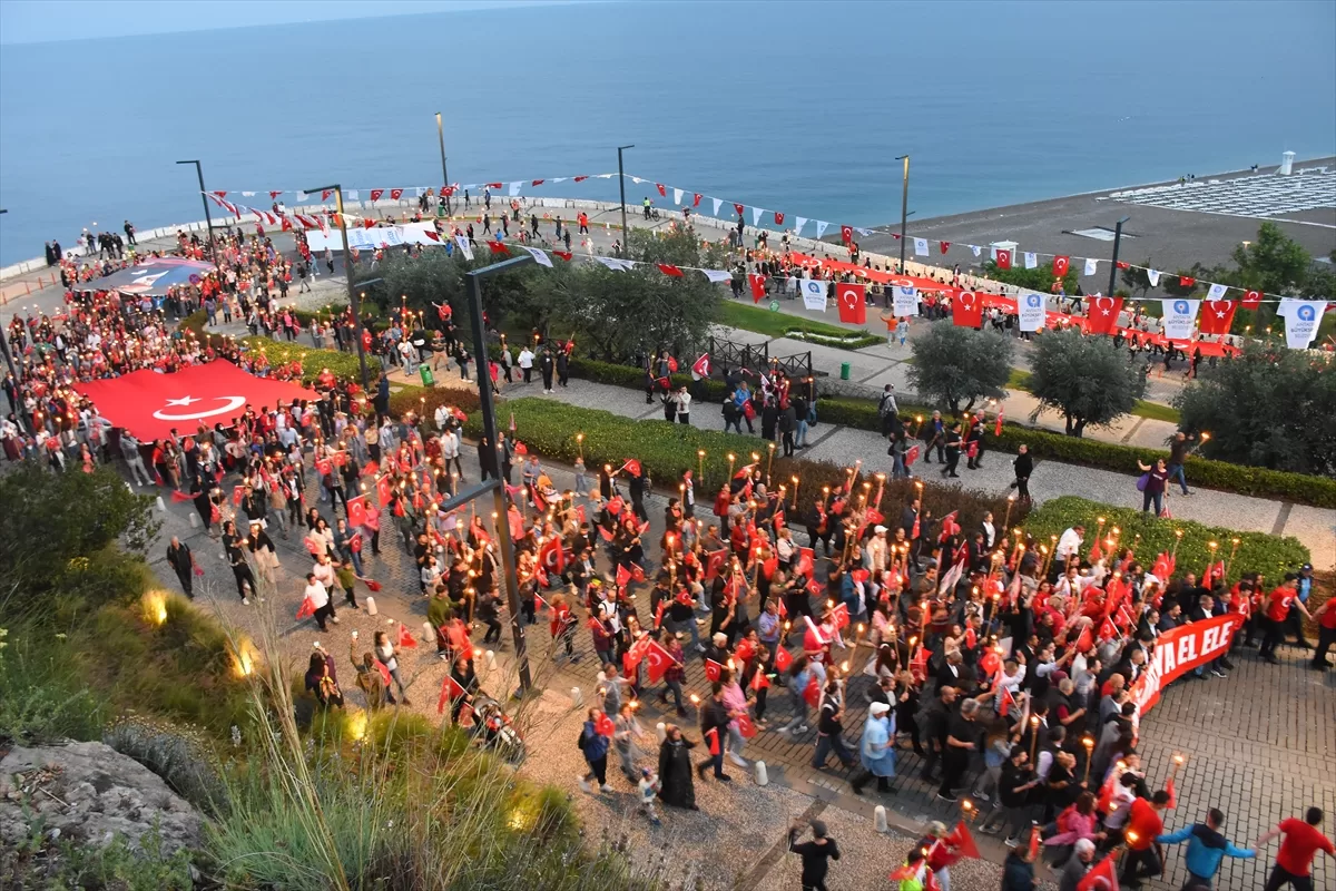 Konyaaltı Varyantı'nda toplanan kalabalık, ellerinde fenerler ve Türk bayraklarıyla marşlar eşliğinde yaklaşık 3 kilometre yürüdü. Antalya Büyükşehir Belediyesi Başkanı Muhittin Böcek, bazı siyasi parti temsilcileri ile milletvekillerinin de katıldığı yürüyüş, Cumhuriyet Meydanı'nda sona erdi.