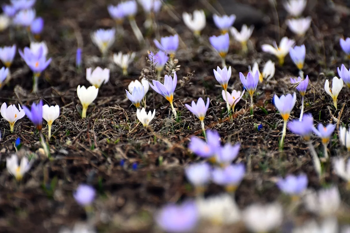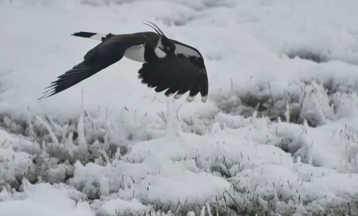 Sarıkamış ilçesinde ilkbaharda açan çiçekler kar altında kalırken, yaban kuşları da yiyecek aradı.